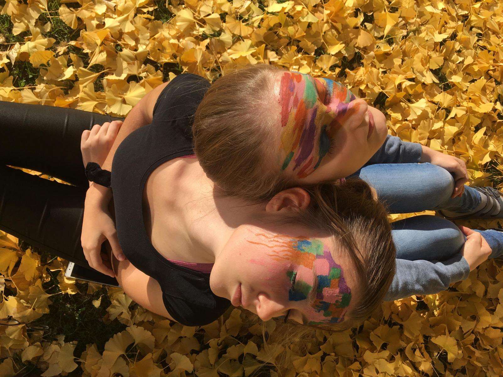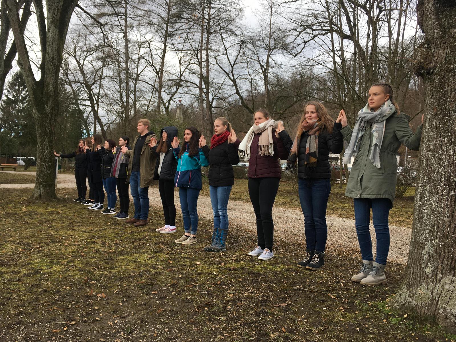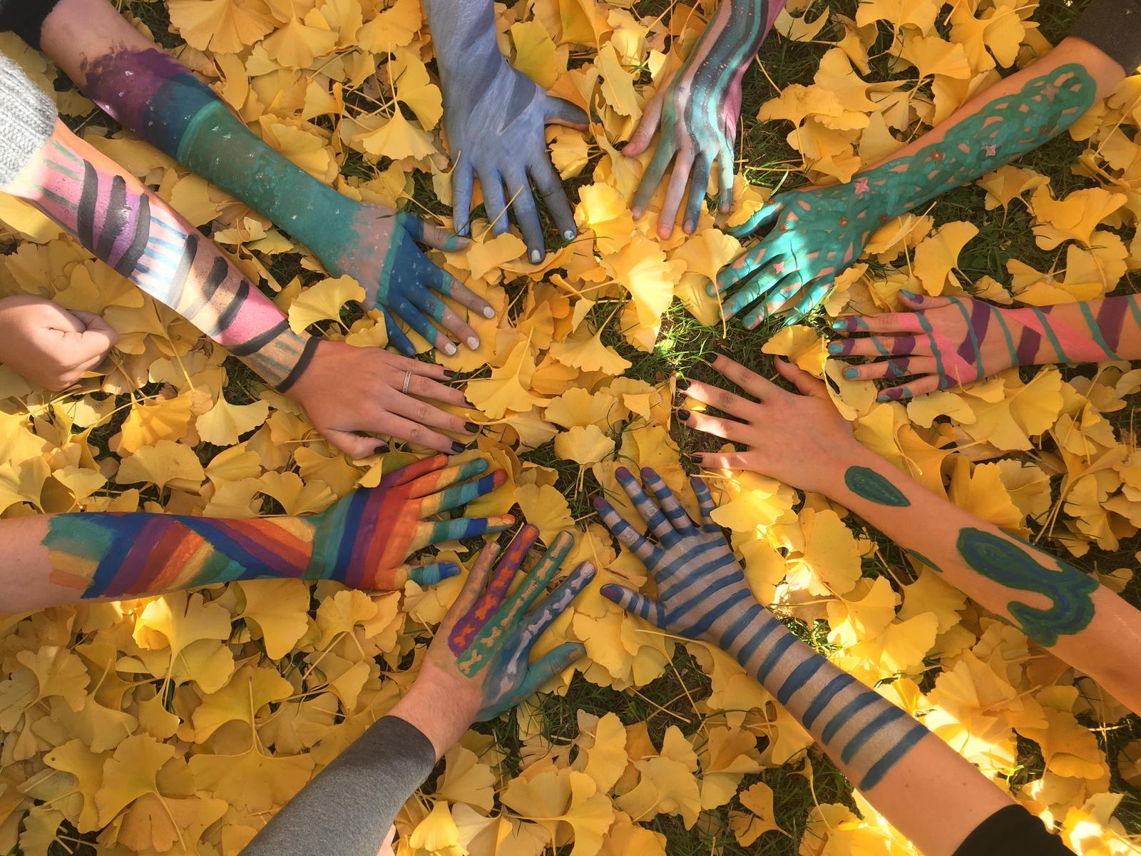 Gleich neben der Bildungsanstalt haben die Schülerinnen und Schüler die Möglichkeit, den Raum des Stadtparks gestalterisch zu erobern. Körper dienen als Malgrund und werden in der Natur inszeniert.