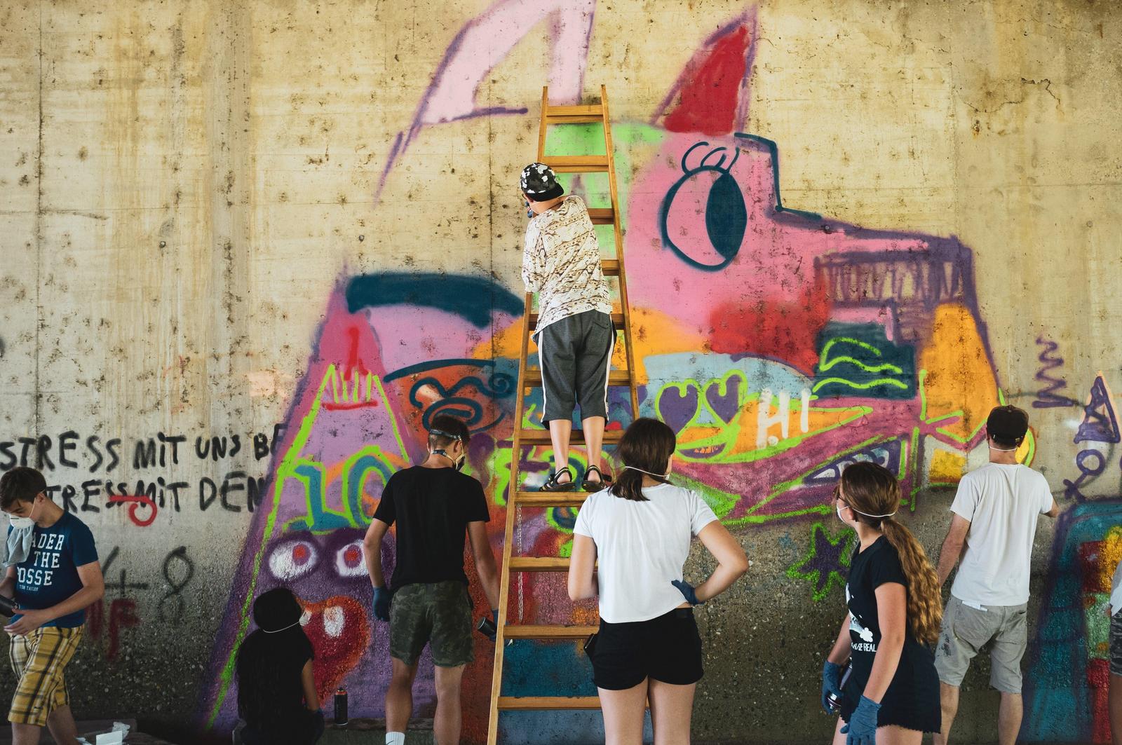 Die Jugendlichen setzen ihre Botschaften mit Unterstützung von Künstler/innen medienwirksam um und präsentieren ihre Arbeiten als riesige Wand-Bilder an öffentlich genehmigten Flächen der Marktgemeinde. Die überdimensional großen Graffitis und Street Art-Bilder zeigen Symbole, die die Werte der derzeitigen Gesellschaft verkörpern.