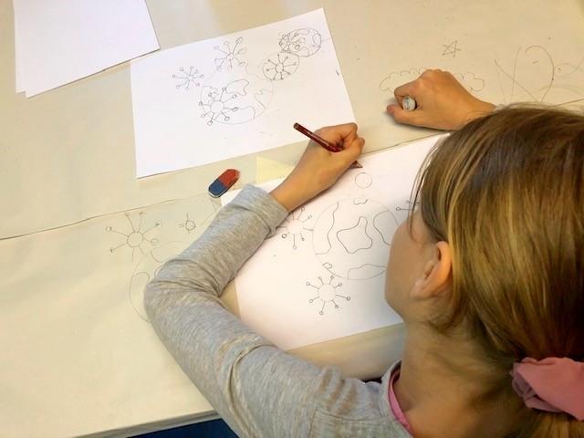 Der Kulturpartner spricht mit den Schülerinnen und Schülern darüber, wie es ist, wenn wieder alles anders ist. Was gehört dazu? Hier können sie erzählen, was sie bewegt und ihre Gedanken, Wünsche oder Sehnsüchte künstlerisch ausdrücken. Einmal erfolgt die Umsetzung spielerisch in Form von Gedichten. In weiterer Folge werden ihre Gedanken auch bildnerisch bearbeitet. Um den Erlebnissen Nachdruck zu verleihen, wird mit Moosgummidruck gearbeitet. Die Gespräche und Gedanken werden auf die Platte übertragen und im Anschluss auf Papier gedruckt.