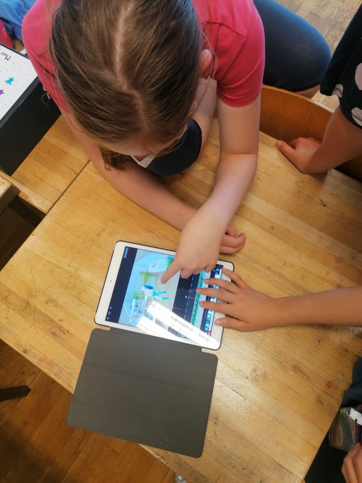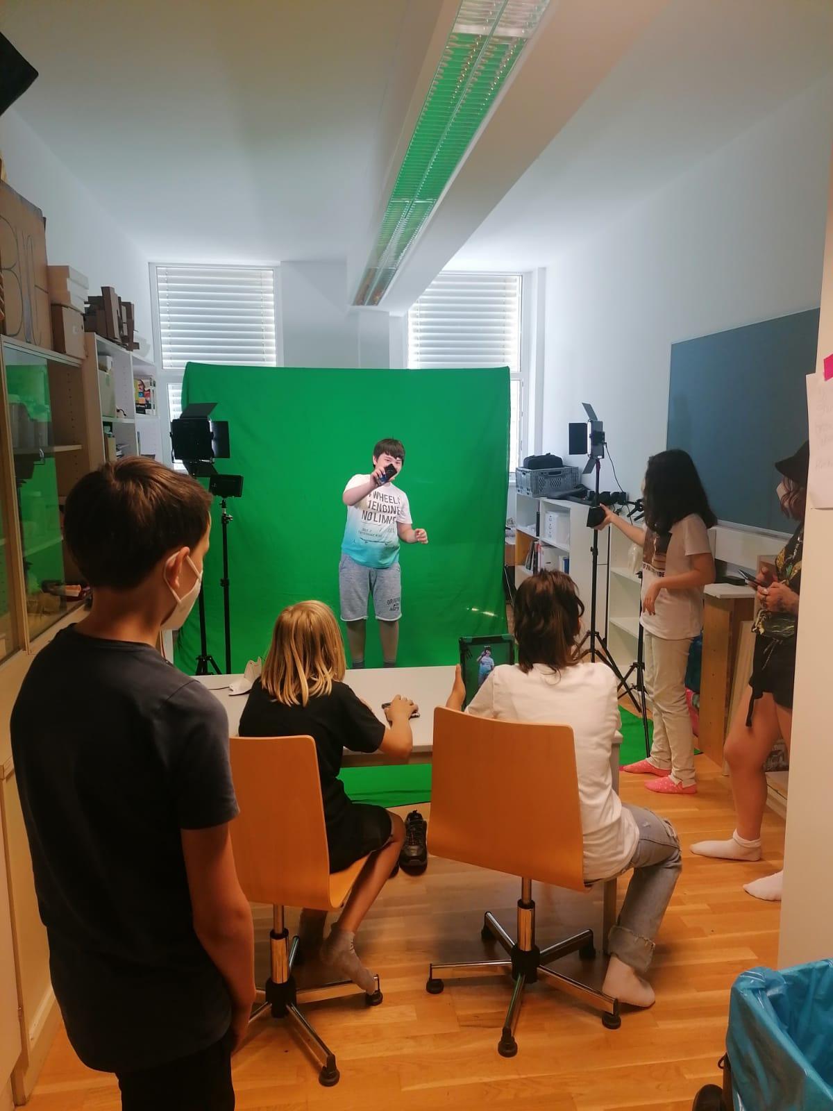 Zum Schluss verwandelt sich das Klassenzimmer in eine Green Box. Die Schüler/innen erhalten eine Einführung in die Green Screen Technik und dem Videoschnitt am Tablet, dann entwickeln sie ein eigenes Storyboard. Mit Hilfe des Kulturpartners und einer App wird ein Video produziert, das durch die einzelnen Räume führt und die jeweiligen Charaktere in eine Erzählung verwebt.