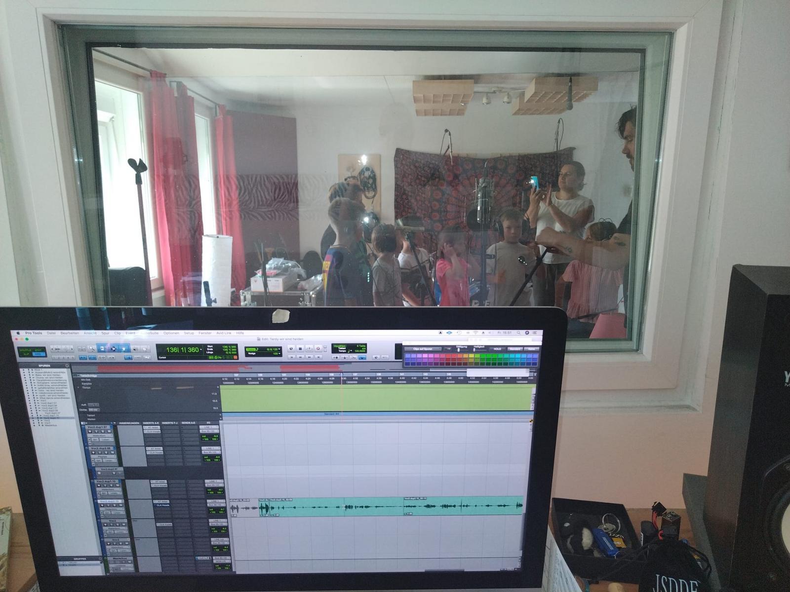 Der Komponist Stefan Terdy kreiert aus den vielen Ideen einen Superheldensong, den die Kids in einem professionellen Tonstudio einsingen.