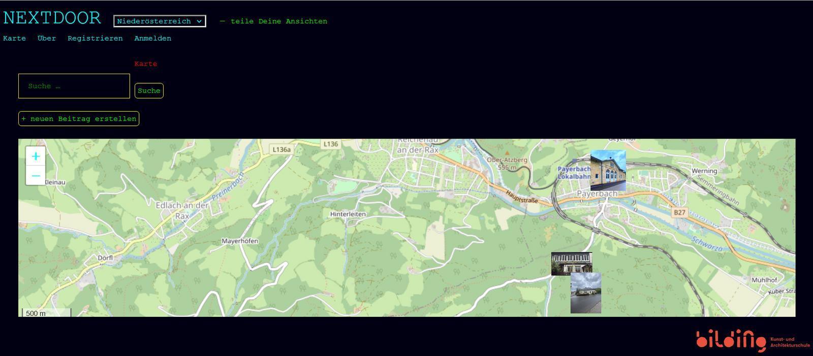 Nach der vorigen Übung fällt es ihnen leichter, das eigene Umfeld besser zu verstehen. Sie setzen sich mit dem “eigenen“ Klima und der Reaktion der traditionellen Baukultur darauf auseinander. In einem Dorfrundgang vollziehen sie die traditionellen Strukturen und Entwicklungen, wie etwa im Ausbau der Siedlungsgebiete, und besprechen diese. Sie bewerten die jüngsten Entwicklungen meist neutral, eher aufzeigend, da sie selbst Bewohnende des Ortes sind und eine Bewertung zu persönlichen Befindlichkeiten führen könnte. Als Reflexion in fächerverbindender Weise verfassen die Schüler/innen am Ende des Projektes einen Eintrag für die interaktive Jugend-Baudatenbank NEXTDOOR von ORTE Architekturnetzwerk NÖ. Dabei wählen die Jugendlichen ein Bauwerk in ihrem Ort aus, zu welchem sie einen Bild- und Textbeitrag verfassen, welcher dann veröffentlicht wird.