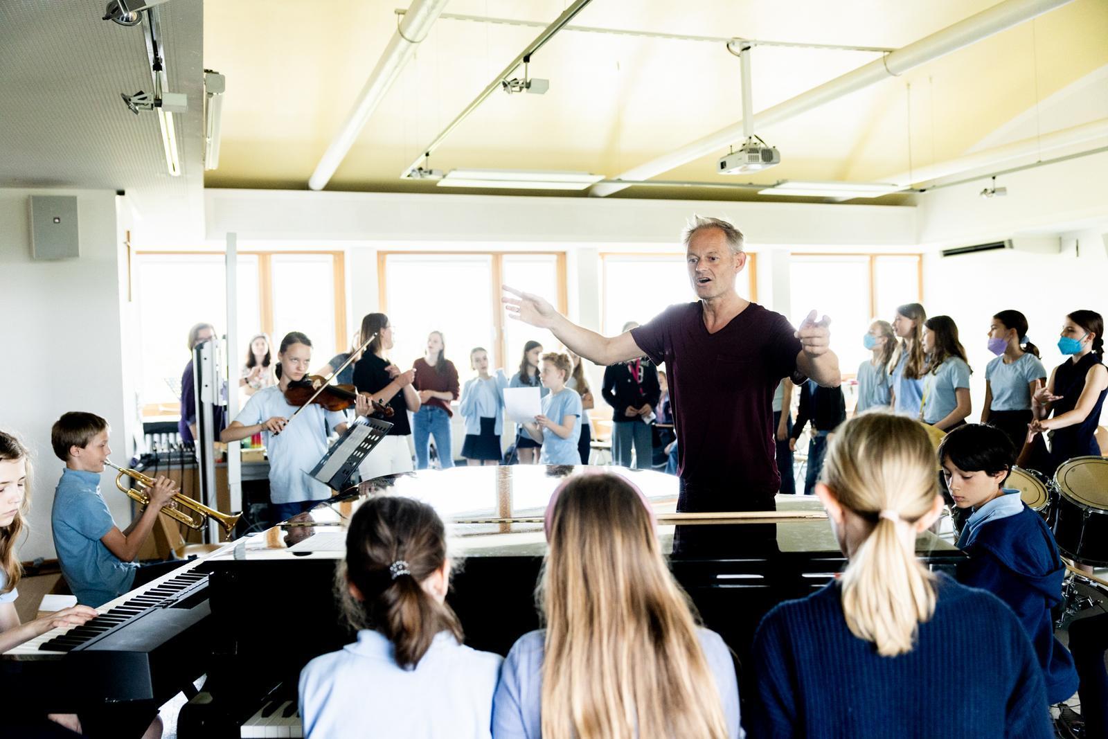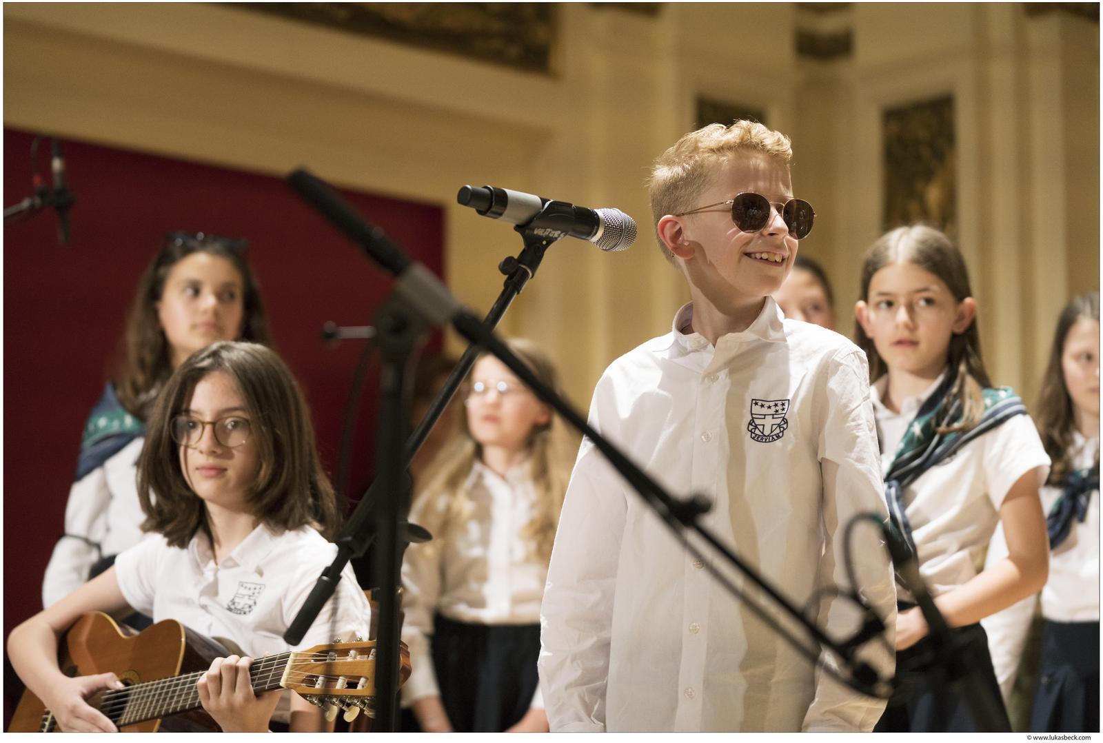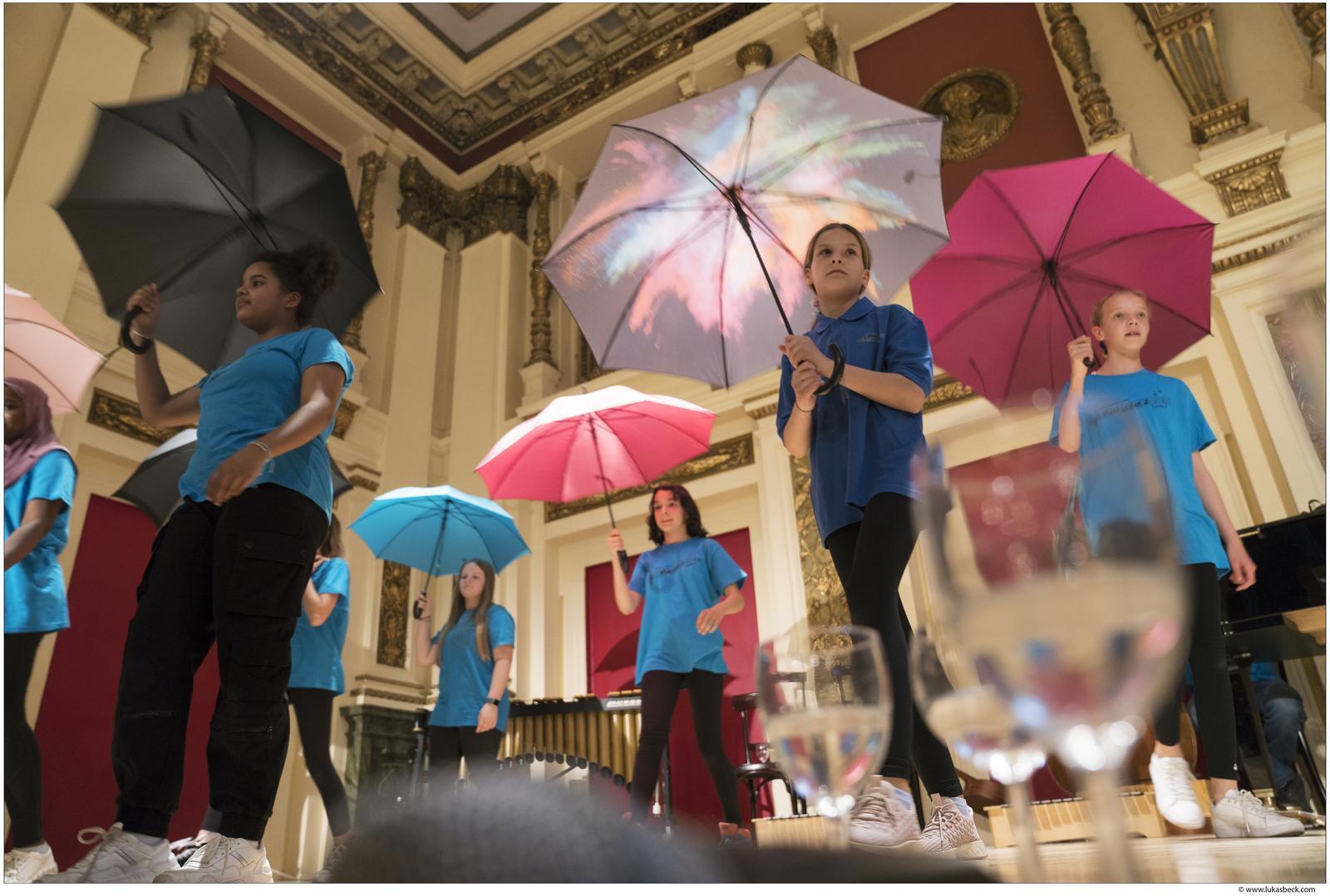 Fünf Schulklassen aus fünf Städten beteiligen sich im Rahmen des länderübergreifenden Kompositionsprojektes “WasserWERKE“. Sie stellen in Musikworkshops gemeinsam mit Musikvermittelnden sowie Musikerinnen und Musikern das Thema Wasser in den Mittelpunkt. Die Schülerinnen und Schüler der 1E des Gymnasiums St. Ursula in Wien arbeiten mit 3 Musizierenden der Wiener Symphoniker und mit einem Komponisten zusammen. Sie beschäftigen sich mit der Frage, wie Wasser überhaupt klingt. Sie komponieren eine Unterwasserwelt, erforschen Instrumente auf völlig neue Klänge hin und entwickeln Texte für einen Song. Die Kinder kreieren in der Intensivwoche nach stundenlanger Arbeit ein zehnminütiges Musikstück. “Der Fluch der Donau“ ist eine Mischung aus experimentellen Klängen und einem Lied. Dieses Stück setzen die Jugendlichen aus einem verfremdeten Donauwalzer in Kombination mit der Musik aus “Fluch der Karibik“ zusammen. Die Schüler/innen musizieren und singen, unterstützt durch die Musiker/innen der Wiener Symphoniker, beim Abschluss-Konzert am 21.5.2022 im Ehrbar-Saal mit großer Freude. Auch die anderen vier Schulklassen präsentieren in diesem Konzert ihre Ergebnisse – spannend, wie unterschiedlich die einzelnen Kompositionen geworden sind!