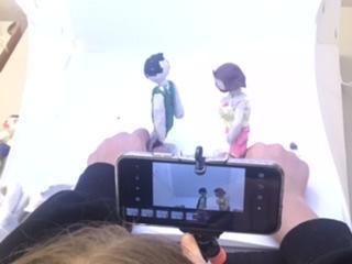 Im vorbereiteten Studio finden die Teilnehmenden das notwendige Equipment: Stative, Handyhalterungen, Lichtquellen, Trickfilmboxen, Bastelmaterialien, Papiere, Farben etc. Sie arbeiten nun an der Fertigstellung der Storyboards. Sie beginnen alsbald mit den ersten Probeeinstellungen und kurzen Testfilmen mit ihren Handys, um abschätzen zu können, ob die Vorhaben auch wirklich so, wie vorgestellt, umgesetzt werden können. Das Medienlabor betreut die Gruppen intensiv. Die technische Handhabung der App gelingt bereits sicher. Innerhalb von insgesamt 12 Stunden produzieren sie Filme, die ihnen auch aufzeigen, wieviel Potential in ihnen steckt. Die jungen Leute profitieren von der guten Zusammenarbeit zwischen den Lehrkräften der Schule und den Kunstschaffenden im Vorfeld des Projektes. Sie vertiefen sich in die Technik und schulen so “wie nebenbei“ auch das Auge. Sie üben sich zu fokussieren und erleben die Teamarbeit als selbstverständlich. Sie nehmen Kunst als Ausdrucksform wahr. Die Schüler/innen zeigen ihre Filme auf den Schulbildschirmen und geben sie anderen weiter.