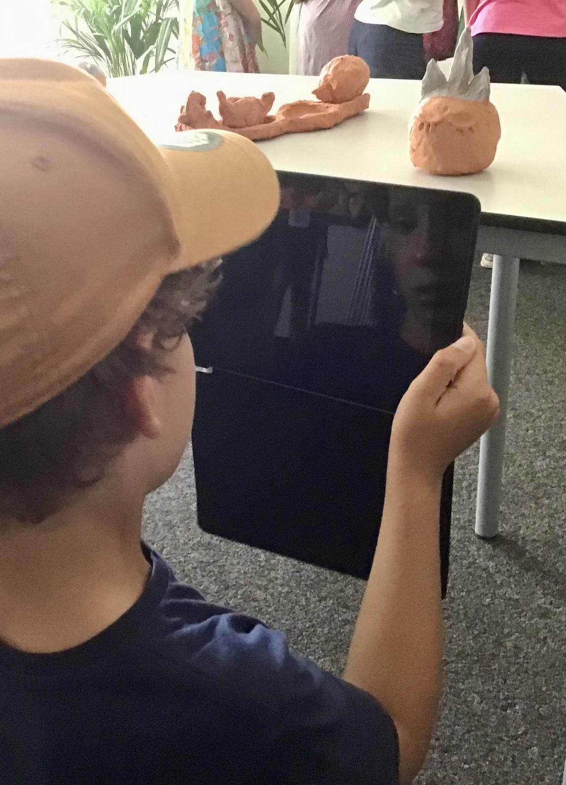 Im zweiten Teil wenden sich die Kinder dem haptischen Material zu, um das Monster aus Ton zu modellieren. Zuerst zeichnen sie einen Entwurf auf Papier, der ihnen bei der anschließenden Umsetzung hilft. Sie modellieren das Monster aus rotbrennendem Ton, einer Farbe, die bei allen gut ankommt. In der letzten Einheit verknüpfen sie die entstandene Tonspur mit einem QR-Code für die Ausstellung. Die Ausstellung findet in den Räumen der Kultureinrichtung statt, wo die Teilnehmenden von atempo und auch eine zweite Schulkasse die Ausstellung besichtigen können.