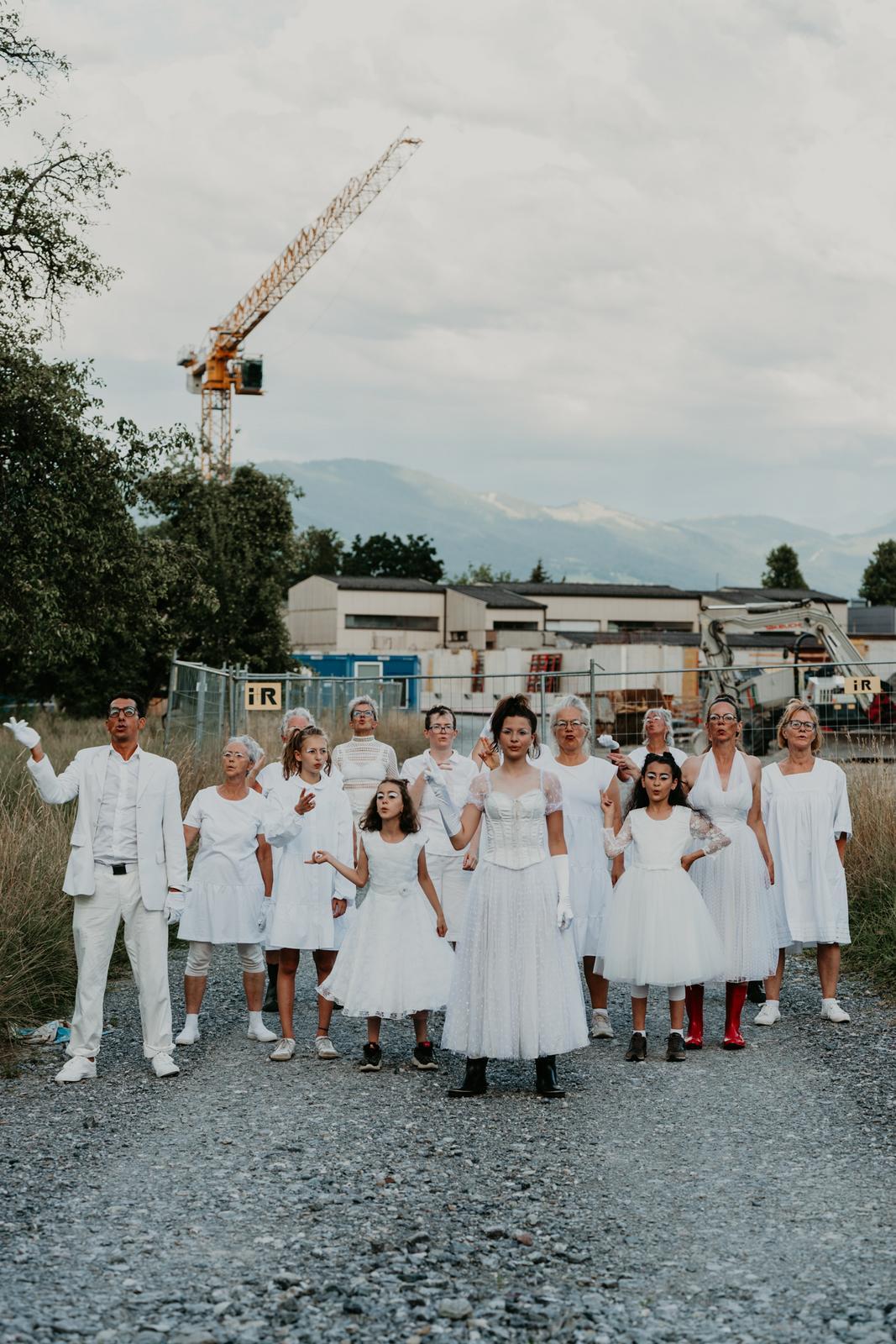 Für das Theaterprojekt recherchieren, interviewen die Schülerinnen und Schüler des BG Lustenau gemeinsam mit den Theaterschaffenden und erarbeiten daraus Fragen. Ein Schriftsteller verarbeitet die Ergebnisse zu einem literarisch-philosophischen Text. Eine Schauspielerin und ein Schauspieler verkörpern an den vier Spielorten jeweils prototypische Figuren. Ein großer Tanz- und Sprechchor aus 19 Menschen allen Alters aus Lustenau und Umgebung geben den Räumen, Orten und Plätzen als weiße Figuren ein lebendiges Bild. Kinder und Jugendliche im Alter von zehn bis 17 Jahren spielen mit Erwachsenen und den Professionellen. Das Publikum fährt zwischen den vier Spielorten – Am Rand / Baustelle / Stadion / Siedlung – mit dem Rad. Es entsteht ein eindrückliches Bild von gefassten Orten und sichtbaren echten Siedlungsbildern.