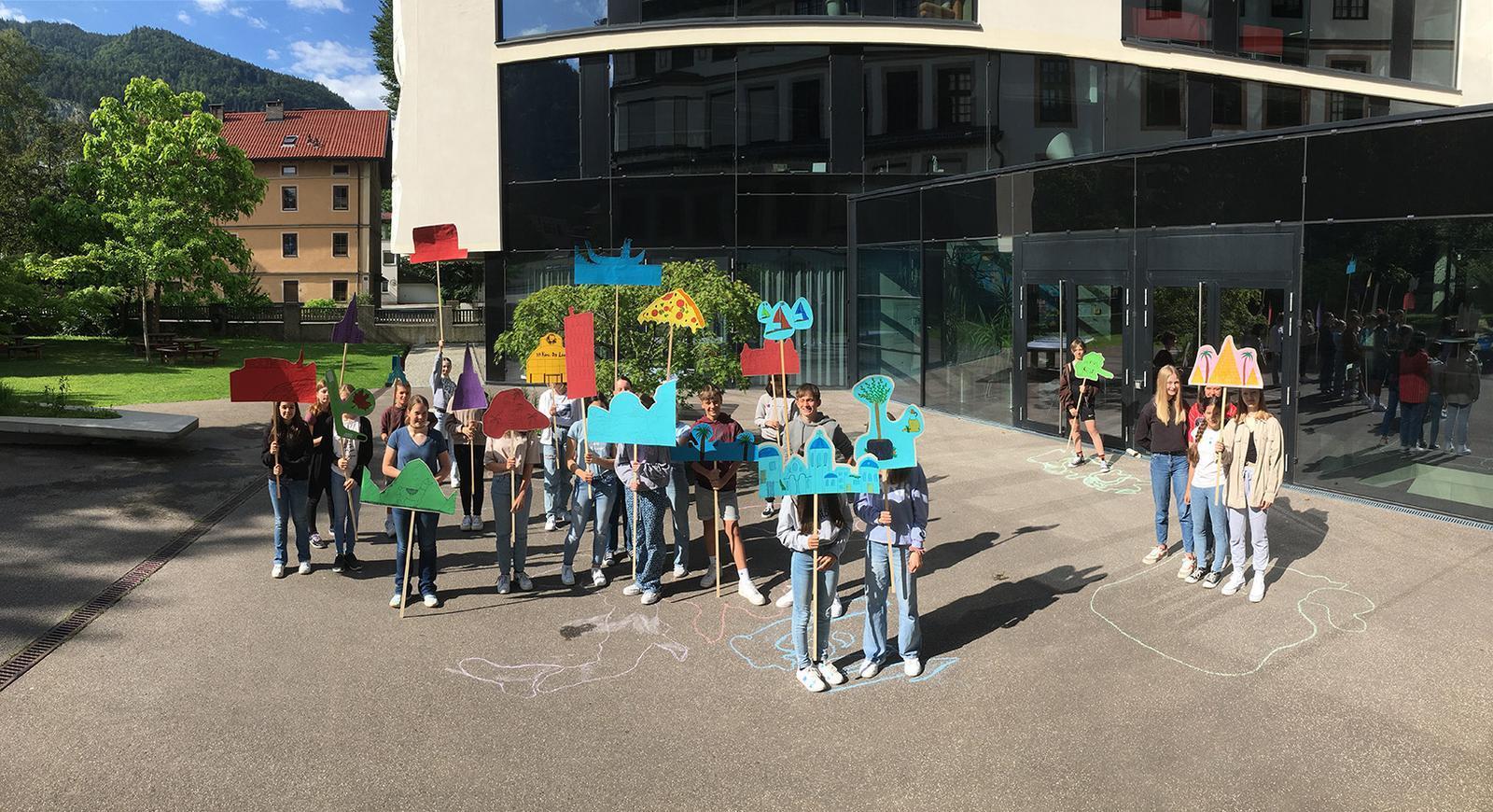 In dem Projekt “Die Welt liegt uns zu Füßen“ von Stiftung FREIZEIT stellen die Schülerinnen und Schüler des BG und BRG Kufstein ihre fiktiven Reisen ins Zentrum. Damit vermitteln sie ihre Sehnsucht nach anderen Ländern und Kulturen als künstlerische Intervention. Durch das Verwenden der Google-Maps-Karte bekommen die Kinder eine Ahnung von Richtungen und Entfernungen auf der Weltkarte und begreifen so, sich darin zu verorten. Räumliches Wissen bedeutet aber nicht nur, eine Weltkarte im Kopf oder auf dem Handy bilden zu können, sondern auch die Vorstellung von maßstäblichen Größenbeziehungen.
