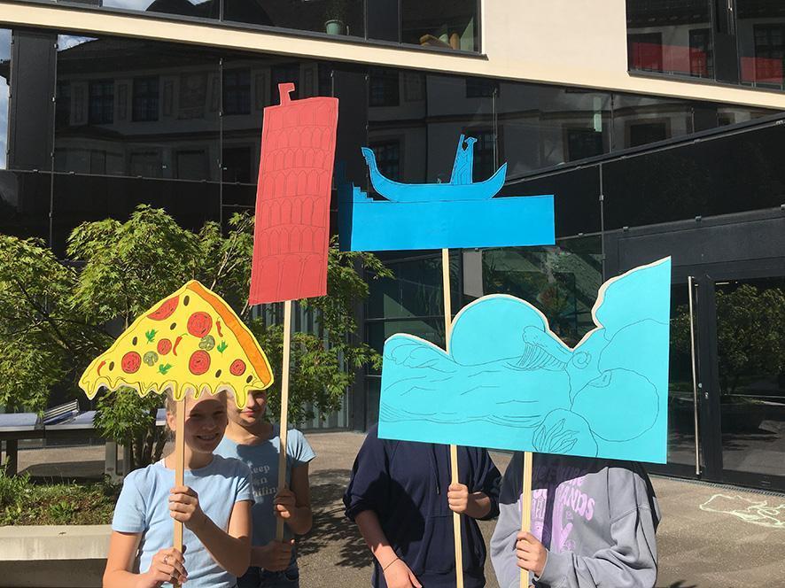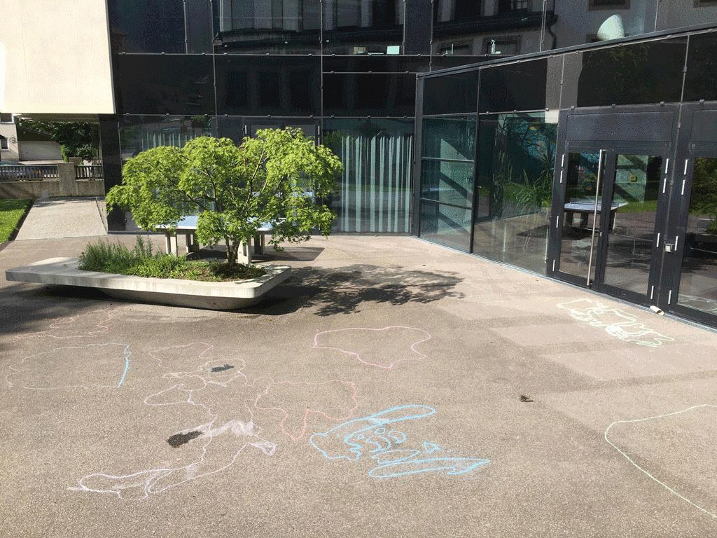 Die Schüler/innen überzeichnen den halböffentlichen Schulplatz großmaßstäblich mit den Kontinenten. Sie füllen bedeutungsvolle Orte mit “Stecknadeln“ aus narrativen Scherenschnittmotiven und den dazugehörenden Geschichten: mit der ausgeschnittenen Pizza lassen sie die italienische Küche hochleben. Mit Pyramidenmodellen stellen sie den Mythos der bautechnischen Meisterleistungen der Ägypter dar. Lamas erinnern an die unendlichen Steppen Patagoniens. Die Schule und Nachbarschaft ist eingeladen die Weltkarte mit immer mehr Reisegeschichten zu füllen.