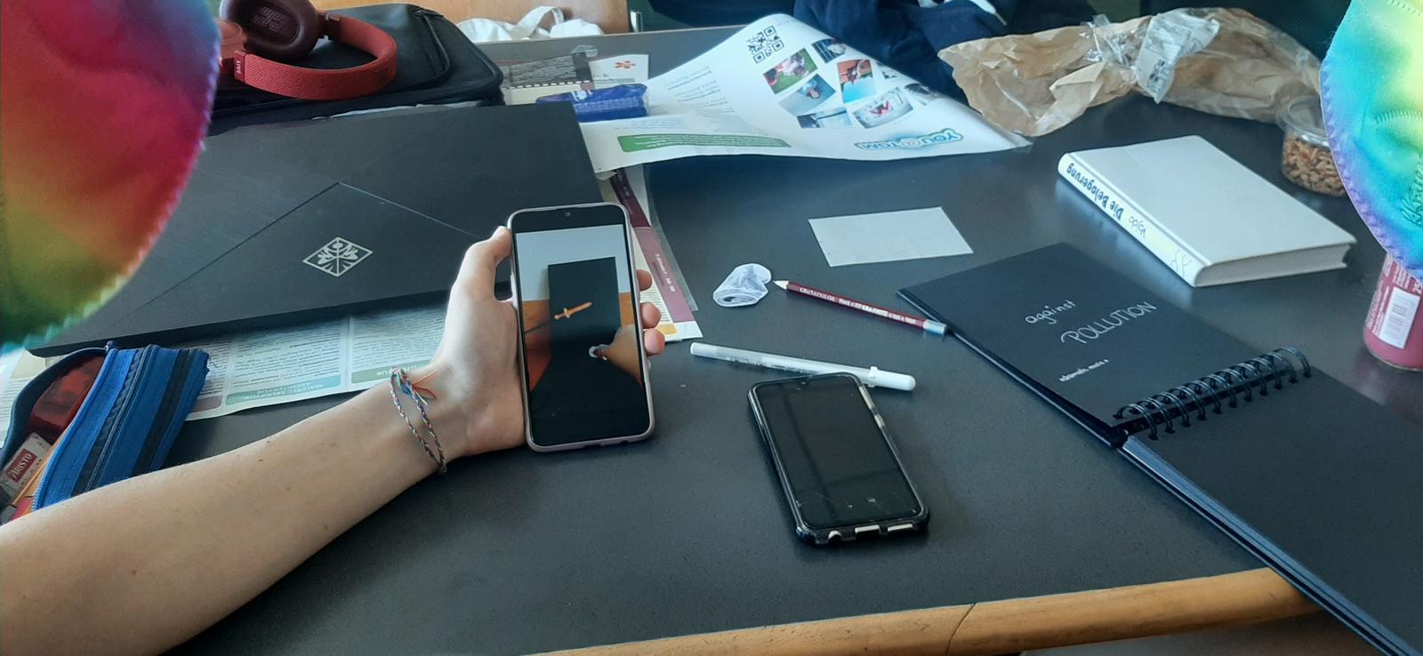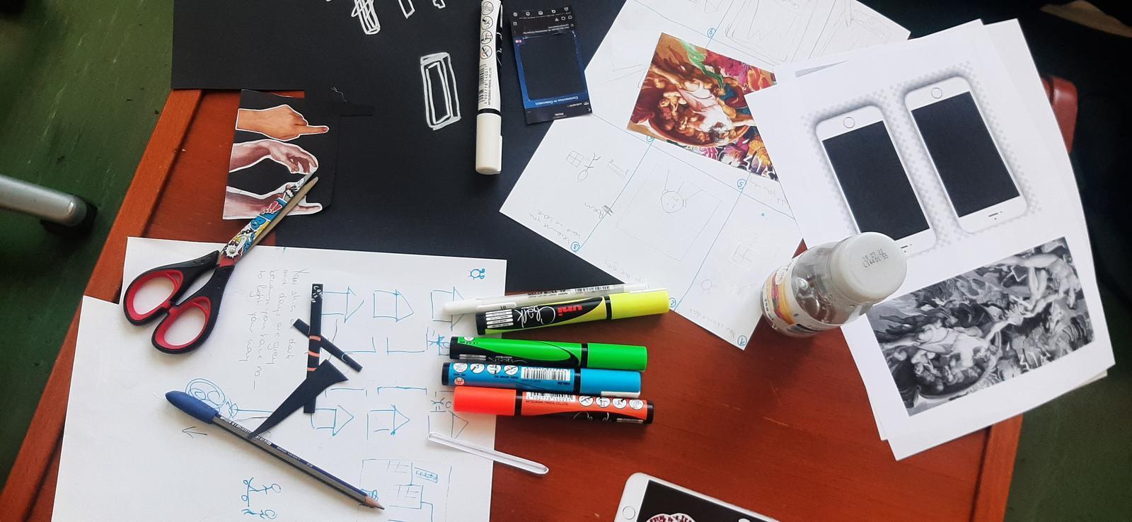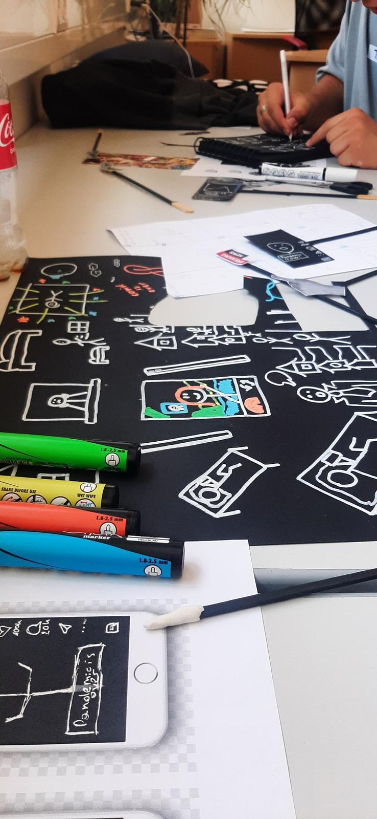 Die Jugendlichen diskutieren gemeinsam die Storylines. Sie verwenden dramaturgische Hinweise zur Unterstützung bei der Strukturierung der Story. Während einige nach Bildmaterial im Internet suchen, dieses skalieren und drucken, entwerfen andere Figuren und Objekte mit farbigen Comic-Malstiften. Es herscht eine kreative Arbeitsatmosphäre, in der die Teilnehmenden Ideen entwerfen, diskutieren, verwerfen und neu gestalten, um eine gemeinsame Story zu erzählen. In der Teamarbeit werden neue Talente von Einzelnen sichtbar. Die Gruppen trainieren durch die englische Arbeitssprache ihre argumentative und kreative Kommunikation. Die Projektleitung bereichert diese mit spezifischem Vokabular. Sie entdecken für sich das haptisches Arbeiten wieder, was eine seltene Ergänzung und Unterstützung für die spezifischen Ausbildungsziele der Schule darstellt. Die Schüler/innen stellen die Storybooks fertig und nehmen diese mit Handykameras auf. Sie stellen die Videos intern vor. Eine Abschlussrunde mit begeisterten Feedbacks beendet den Workshop.
