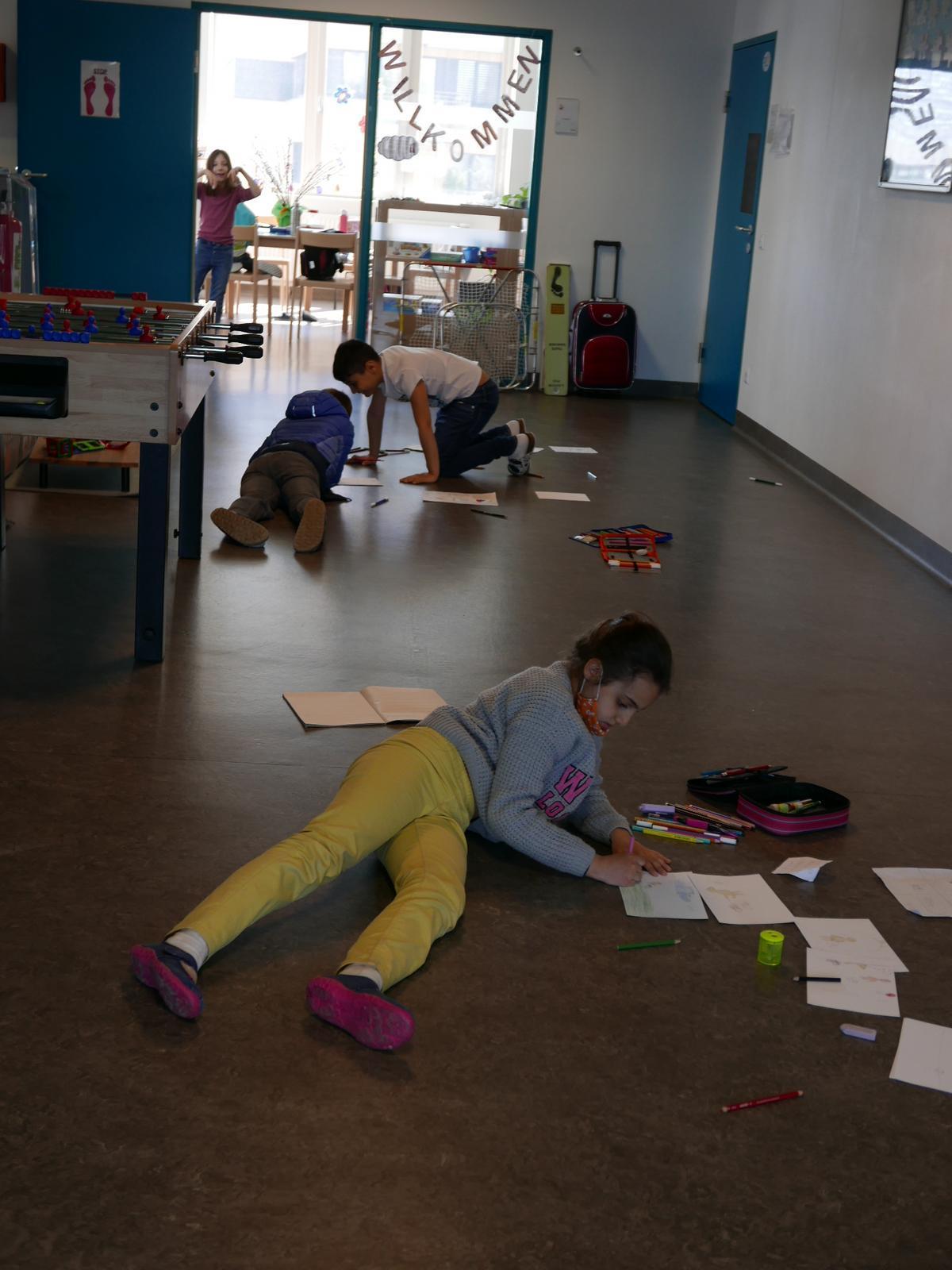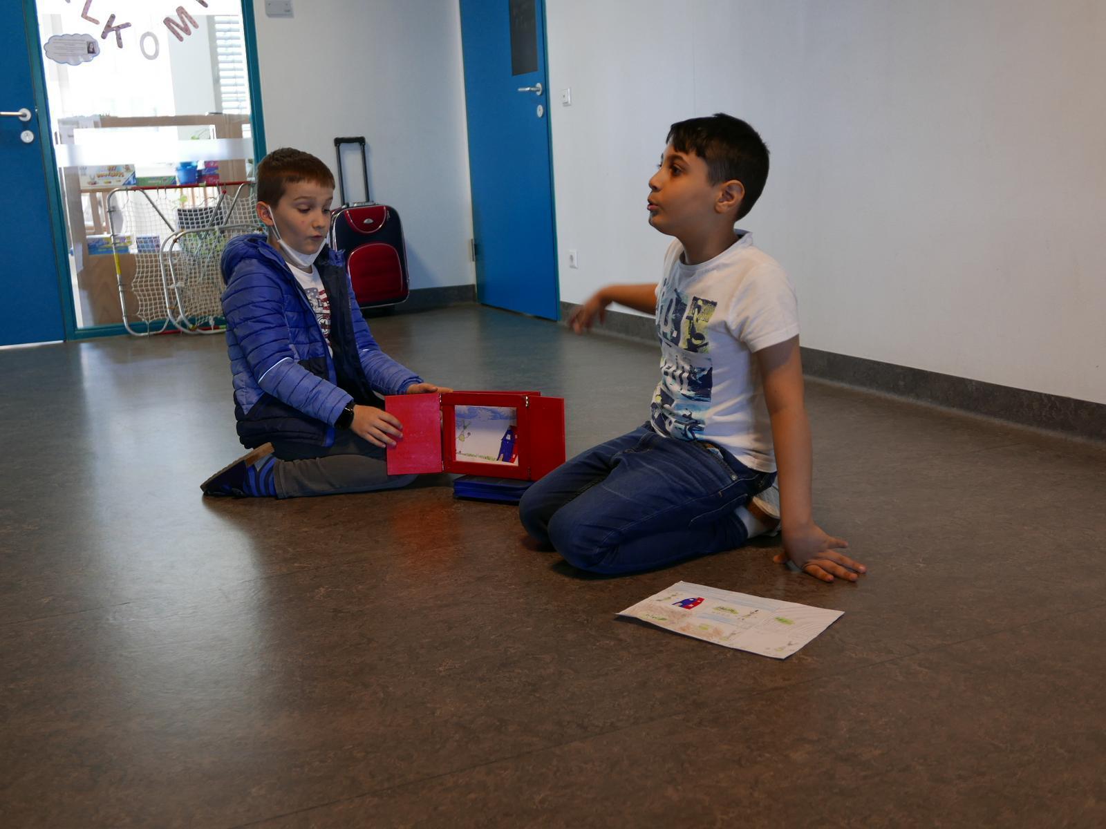 Sie arbeiten ihre Zeichnungen auf A5-Kartons weiter aus. Dabei sprechen die Kinder ihre Geschichte und üben das Formulieren der Sätze für die spätere Präsentation. Sobald das Bildkartenset fertig ist, ziehen sich die Gruppen zurück und proben die Präsentation miteinander in ihre Gruppe. Dafür verwenden sie kleine Kamishibai-Theater aus Pappe oder aus Holz. Die ersten Gruppen führen ihre Geschichte dem Workshopleiter vor und bekommen ein Feedback, mit dem sie ihre Präsentation noch verfeinern können.