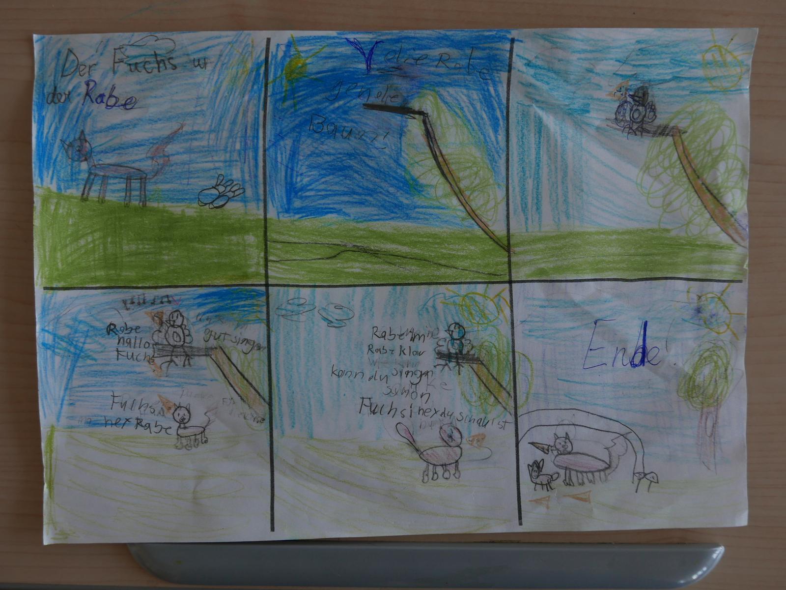 Die Kinder bearbeiten in Kleingruppen eine Geschichte. Zuerst besprechen sie die zu erzählende Story. Dann zeichnen sie Storyboards mit einfachen Skizzen. Sie überlegen, mit welcher Technik die Bilder ausgeführt werden sollen und wählen ihre Bildausschnitte.