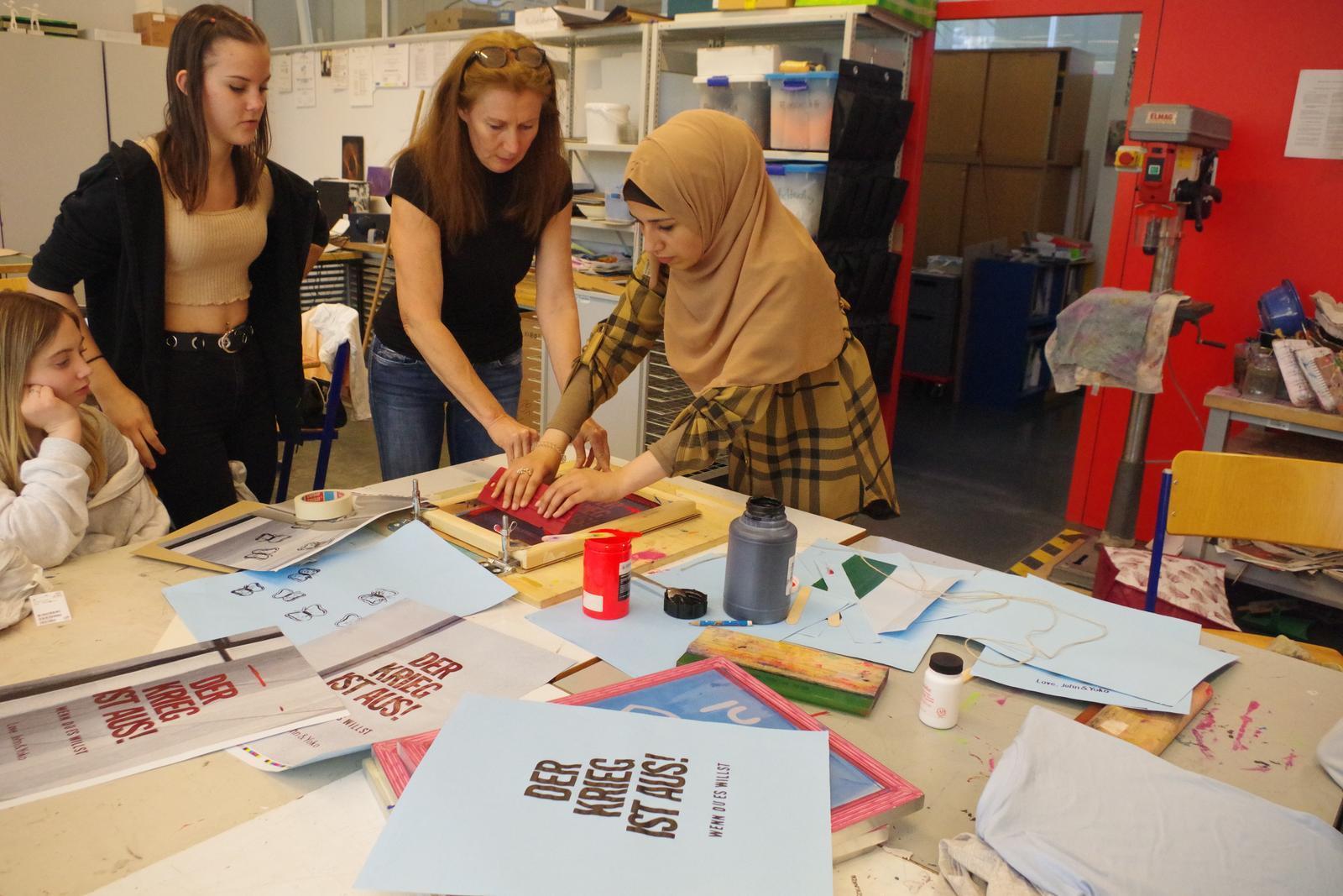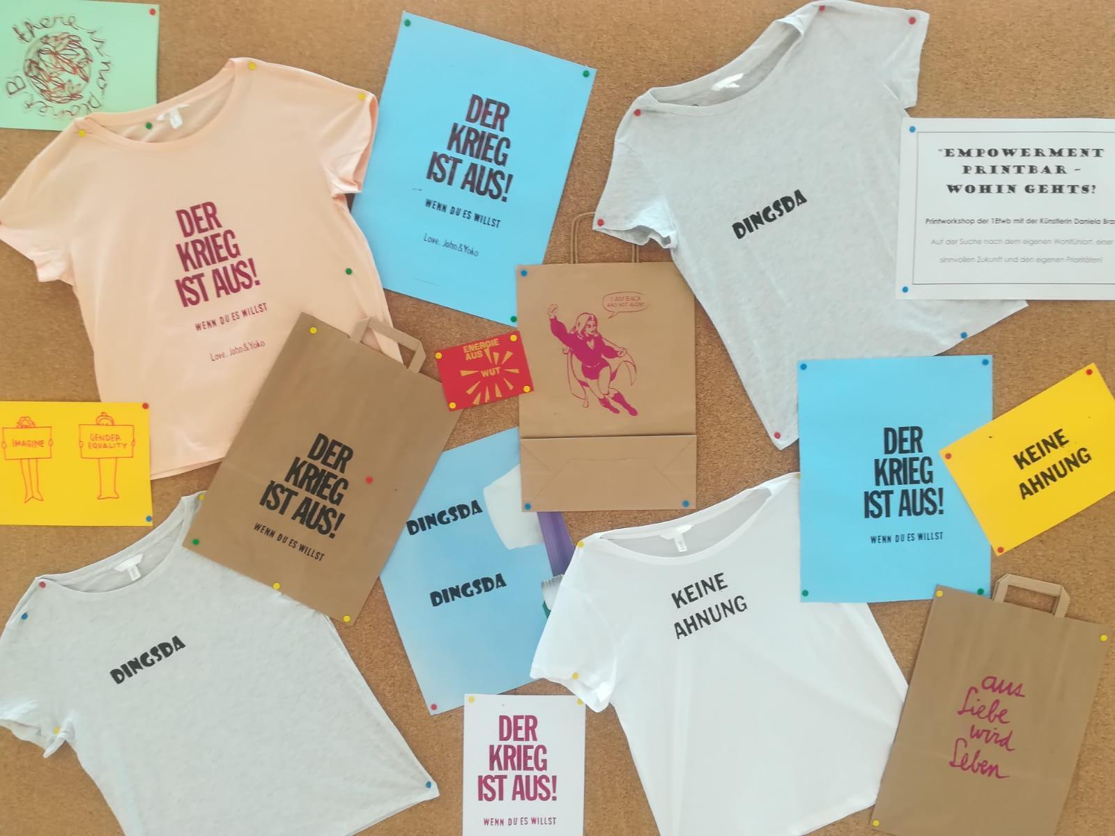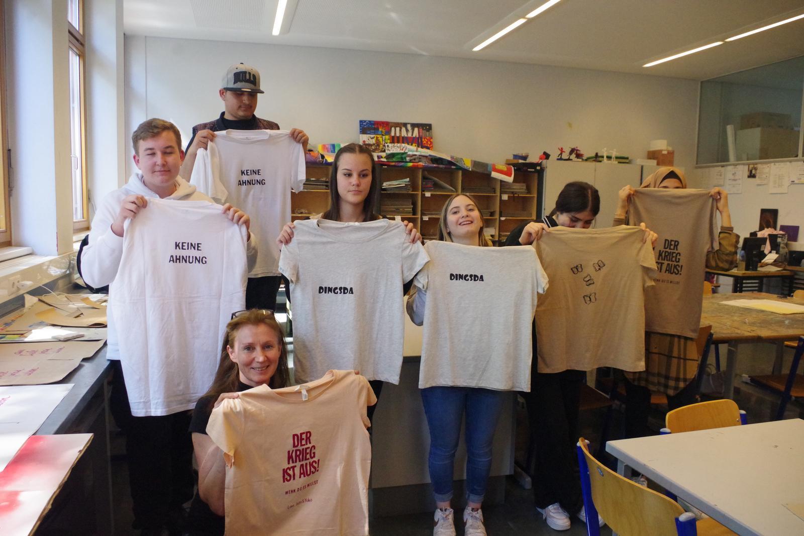 Die Schüler/innen drucken T-Shirts zusammen mit anderen Motiven. Alle erhalten zur Motivation ein neues T-Shirt du bedrucken dieses mit ihrer Botschaft. Sie sind stolz auf das Ergebnis. Mit einer kleinen Ausstellung in der Schule machen die Beteiligten das Projekt sichtbar.