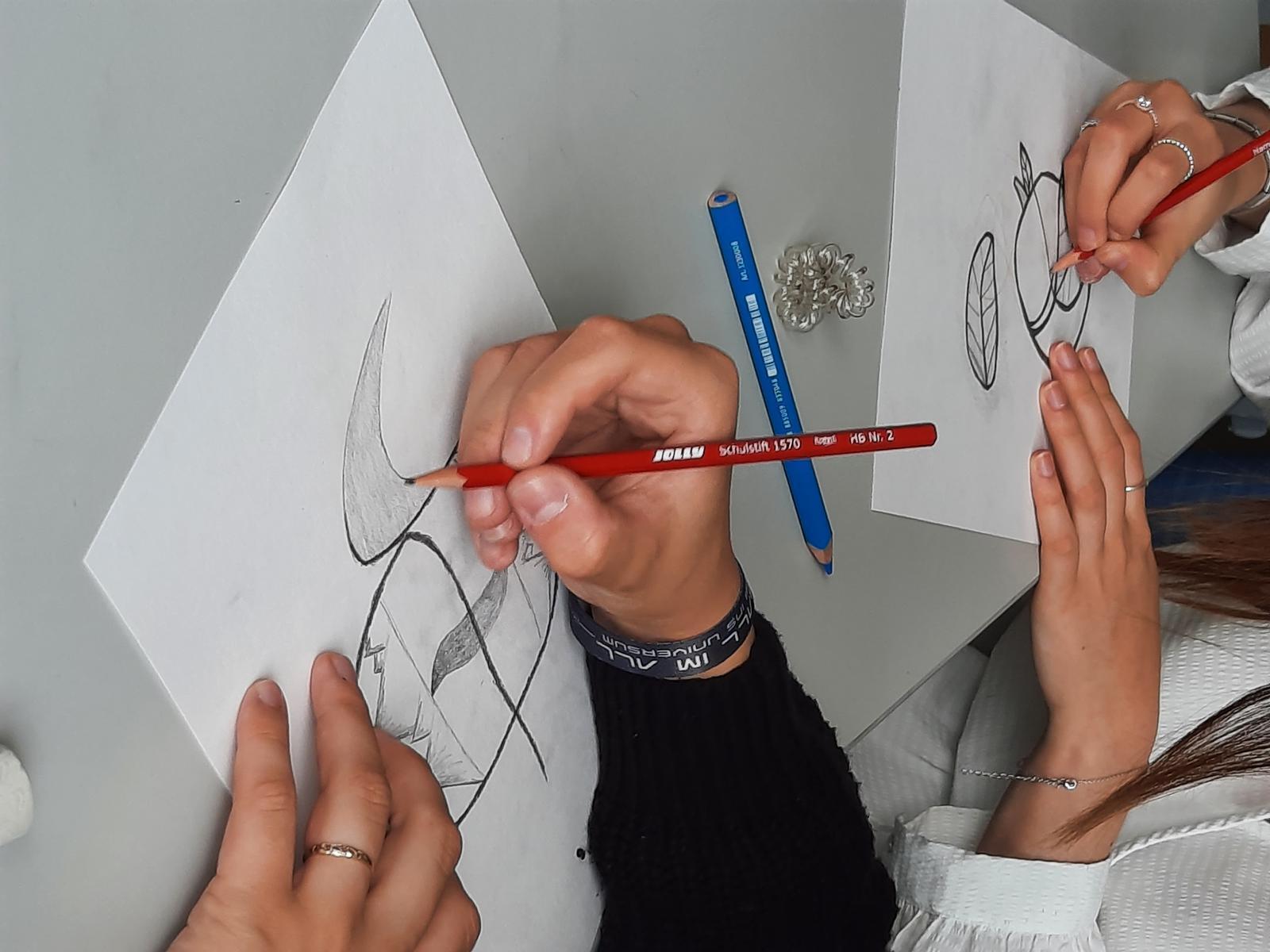Im zweiten Teil befassen sich die Schüler/innen mit dem praktischen Zugang des Zeichnens. Alle zeichnen nach einfachen Übungen individuelle Muster und Figuren. Sie sind in der Lage erste Bild-erzählerische Schritte zu tun. Mit der Zeit stärken sie ihre Selbstsicherheit und ihre Neugier soweit, dass einige beschließen ihre Zeichnungen als „Bild-Tagebuch“ weiterzuführen.