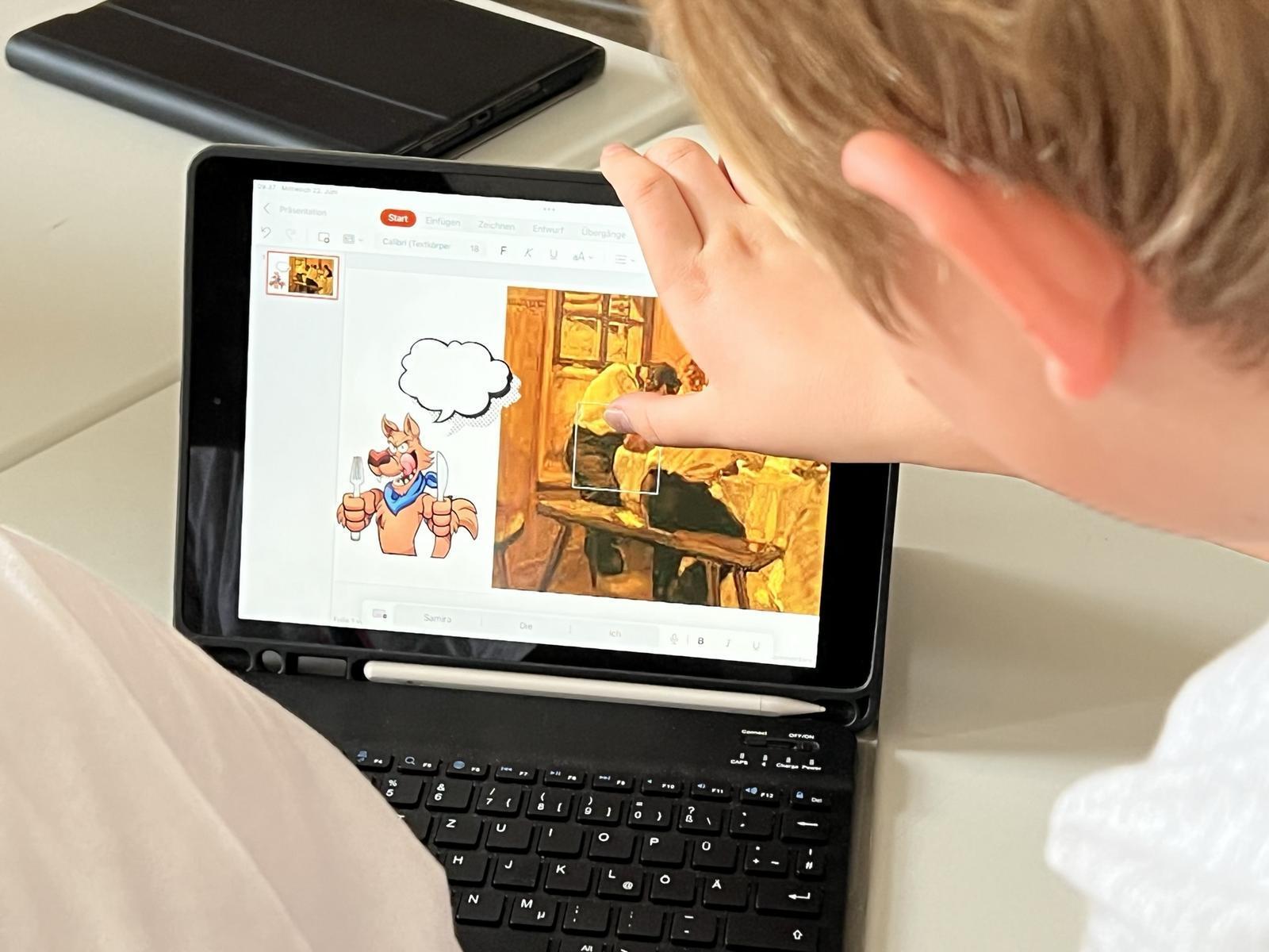 Die Schüler/innen entdecken gemeinsam mit einem Medienpädagogen und einer Kunstpädagogin des Museums der Stadt Lienz viele Einsatzmöglichkeiten für die neu erhaltenen Tablets. In mehreren Einheiten tauchen sie so in aktuelle digitale Themen ein. Die jungen Leute bearbeiten und zeichnen Bilder am Tablet mit der App Sketchbook. Sie eignen sich mit diversen freien Onlinetools das Freistellen von Grafiken an, die sie anschließend in die Kunstwerke einbauen. Die Kinder beschäftigen sich auch mit Bild- und Nutzungsrechten und erforschen so, welche Bilder sie wann und wo verwenden dürfen.