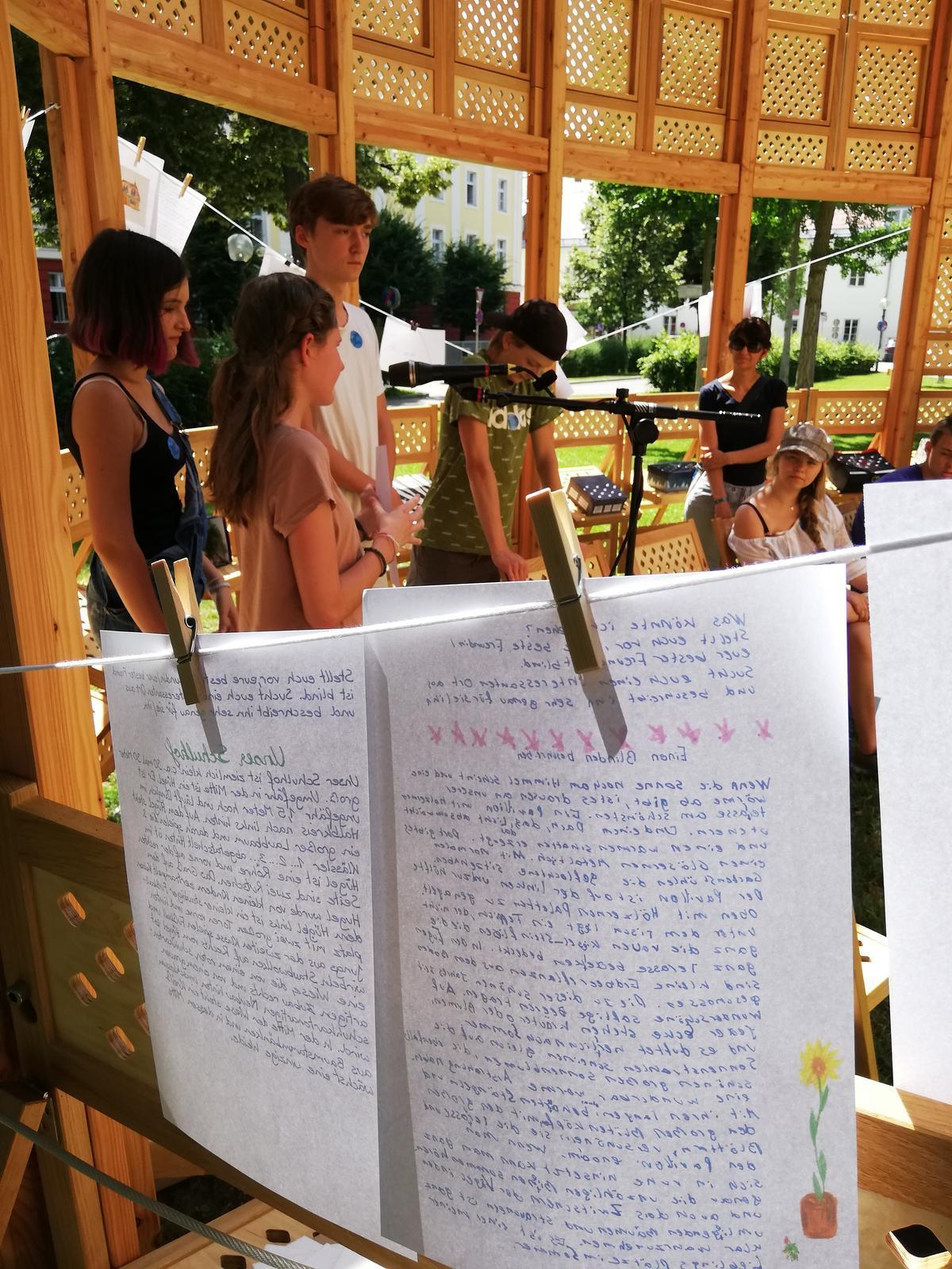 Im Deutschunterricht gestalten die Kinder gemeinsam mit der Kultureinrichtung Architektur-Spiel-Raum-Kärnten als Einstiegsprojekt “Bücher in der Schachtel“. In diesem Vorhaben bringen sie die Inhalte von (Jugend)büchern in eine räumliche Modellsituation. Die jungen Menschen drücken in den folgenden Wochen mittels einfacher, aber wirkungsvoller Aufgaben unterschiedliche Begriffe in Skizzen aus und setzen diese in kleine Modelle und künstlerischen Werken um. Sie besuchen das Domenig-Steinhaus und finden dort viele Anregungen für weitere Texte und Skizzen. Sie präsentieren diese schließlich öffentlich im “Salon Inge“ im Rahmen der Bachmanntage im Co-Forum vor dem Architektur Haus Kärnten.