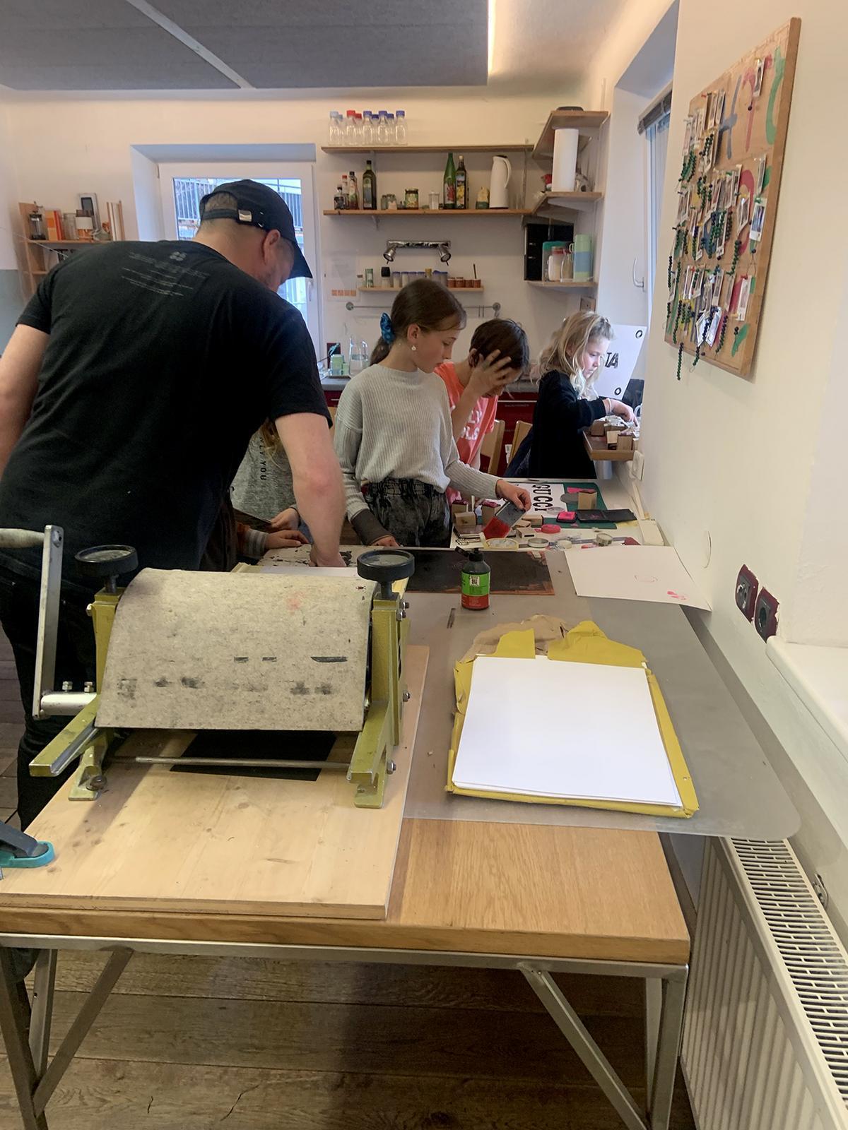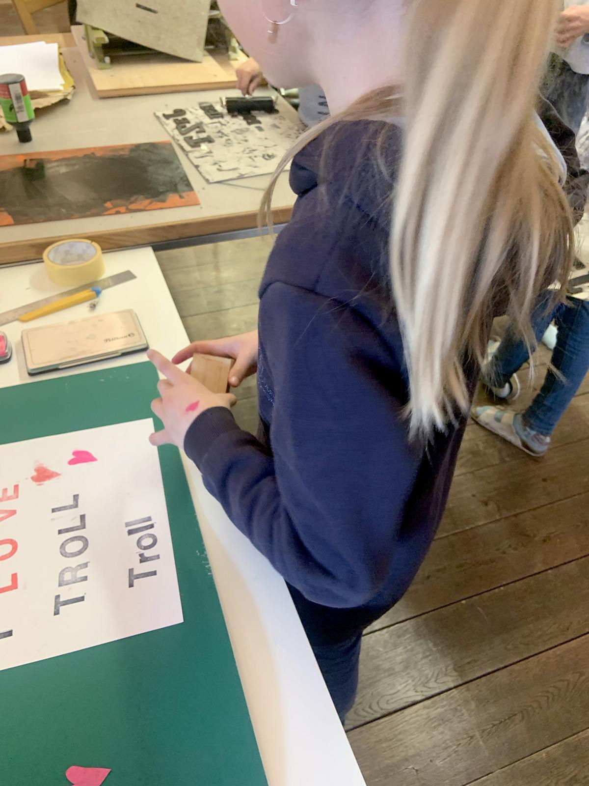 Das zweite Workshop-Modul findet direkt in der Schule statt. Das Design-Team kommt mit der Druckmaschine, die in der Fachsprache Nudel genannt wird, den Holzbuchstaben, Farbe, Rolle und viel Papier in die Räume der Schule. Die jungen Leute haben sich alle schon Texte und Botschaften überlegt. Nun geht es darum, dass sie diese auf einen Karton setzen. Sie denken über die Buchstabengröße, das Format und die Gestaltung nach. Sie produzieren etliche Verkaufplakate für den Shop in der Schule. Aber auch Glückwunschposter sowie Liebesbotschaften bringen sie auf Papier. Sie leben ihre Fantasien grenzenlos aus und basteln sehenswerte Poster. Die Schüler/innen erkunden nicht nur das Druckverfahren wie zu Gutenbergs Zeiten, sondern üben sich auch in der Kommunikation. Sie fördern ihre demokratischen Gedanken durch die Möglichkeit eigene Botschaften auf ein Plakat zu drucken und spüren dies als ein Moment der Selbstermächtigung. Dieser Druckworkshop ist wieder ein guter Beweis dafür. Am Ende präsentieren sie stolz ihre Poster.