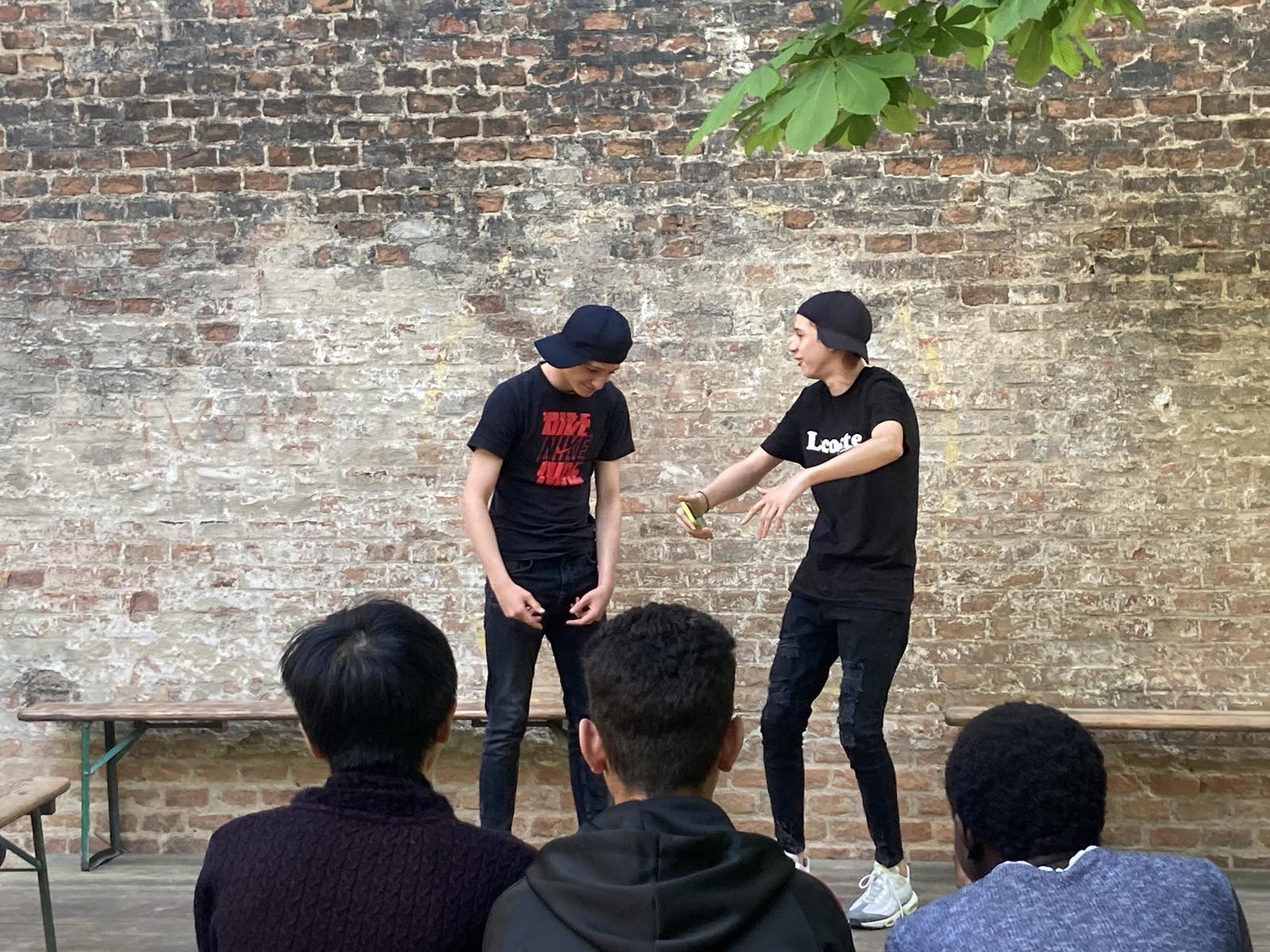 Die Schülerinnen und Schüler der Polytechnischen Schule Burggasse in Wien sammeln über Brainstormings in der Gruppe Themen aus ihrer eigenen aktuellen und jüngeren Vergangenheit. Sie befassen sich beispielsweise mit der Übersiedelung nach Österreich und den vom Pandemiealltag geprägten Lebenswirklichkeiten. Sie priorisieren und verdichten ihre Sammlung gemeinsam mit dusha connection sowohl musikalisch als auch theatral. Die Jugendlichen teilen diesbezügliche Fragestellungen, Hypothesen und Erkenntnisse mit der Großgruppe. Sie entwickeln dazu in Subteams kleine improvisierte Dialoge und Spielszenen. Sie nutzen ihre Smartphones und recherchieren damit Musik und Sounds zur musikalisch-szenischen Arbeit. Sie eignen sich den Text eines Liedes an, um diesen im Chor zu singen. Es entstehen mehrsprachige Texte und Sounds, die sie am Ende des jeweiligen Workshoptags in kleinen Ensembles nacheinander auf einer Bühne präsentieren. Die beobachtenden Schüler/innen, Kunstschaffenden und Lehrenden reflektieren diese Darbietungen ohne Bewertungen in konstruktiven Feedback-Schleifen. Die Projektgruppe erhält ihre besonderen Stärken und Entwicklungsfelder mit einer ermutigenden, wertschätzenden Haltung rückgemeldet. Die jungen Leute zeigen mit ihrem vorherrschenden Stimmungsbild zum Abschluss und Abschied ihre Freude an den künstlerischen Zugängen. Sie erleben eine Unterstützung und Bereicherung in ihren sprachlichen, nonverbalen und kreativen Ausdrucksmöglichkeiten.