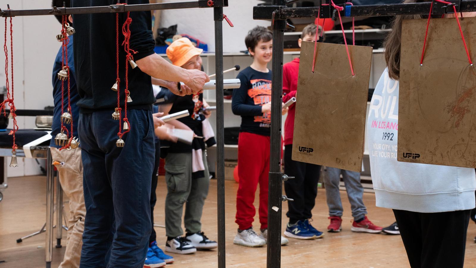 Dazu haben die Kinder verschiedenstes Instrumentarium spielerisch kennengelernt. Alle Arten von Glocken, Glöckchen, Metallplatten, Holzbalken, Trommeln bis hin zu "nichtmehr"-Instrumenten wie Steine oder die eigene Kleidung. Dabei haben die Kinder erfahren, dass es zum Musikmachen nicht unbedingt Instrumente braucht, sondern dass jedes Ding seine akustischen Möglichkeiten hat, mit denen sich musizieren lässt.