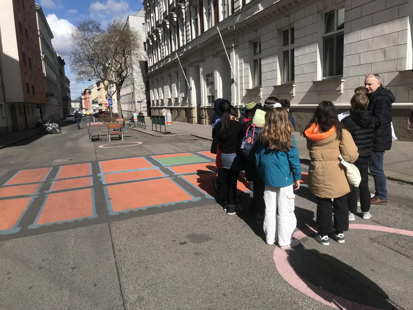 Im Projekt "Supergrätzl – super Platz" wurde mit einer 2. Klasse ein vielbeachtetes Modell aus Barcelona bearbeitet: Dort wurde das Konzept der "Superilles: Superblocks (Streets for People)" entwickelt um die schlechte Wohn- und Lebenssituation der Bewohner/innen zu verbessern. Die für Barcelona typischen quadratischen Blockraster der Straßenzüge werden bei den Superblocks in eine neue Ordnung gebracht und in Bezug auf den Verkehr umstrukturiert. Innerhalb dieser Superblocks haben Fußgänger/innen und Radfahrende Vorrang. So gewinnt die Nachbarschaft öffentlichen Raum zur Gestaltung und Begegnung zurück.