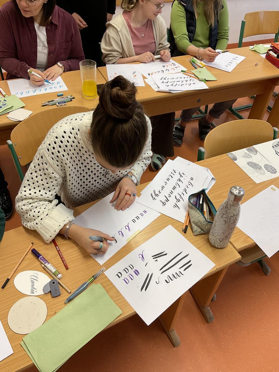 Die Kalligrafin und erfahrene Kursleiterin Claudia Dzengel, die in engem Kontakt zum Schriftmuseum Bartlhaus steht, hielt zwei Workshops für interessierte Schüler/innen der Berufsschule Altmünster aus unterschiedlichen Lehrberufen rund um Gastronomie und Tourismus ab. Nach dem Kennenlernen der Werkzeuge Spitzfeder, Brush-Pen und Fineliner, der Copperplate Schrift, sowie Grundregeln in Komposition und Verzierung, erstellten die Schüler/innen individuelle Gestaltungen für ihre unterschiedliche berufliche Praxis in einer Kombination aus handschriftlichen Elementen und gezeichneten Buchstaben – dem so genannten Lettering. Das Interesse der Schüler/innen war sehr groß, da gerade im Tourismus Gestaltungen in individueller Handschrift den Schriftstücken eine besondere persönliche Note verleihen. Die Kursleiterin ging auch auf das kurz bevorstehende Osterfest ein und zeigte aktuelle Schrift-Design-Ideen, die die Schüler/innen gleich praktisch umsetzen konnten. Dadurch wurde ihnen die Kunst des schönen Schreibens, die Kalligrafie, praktisch und anschaulich vermittelt.