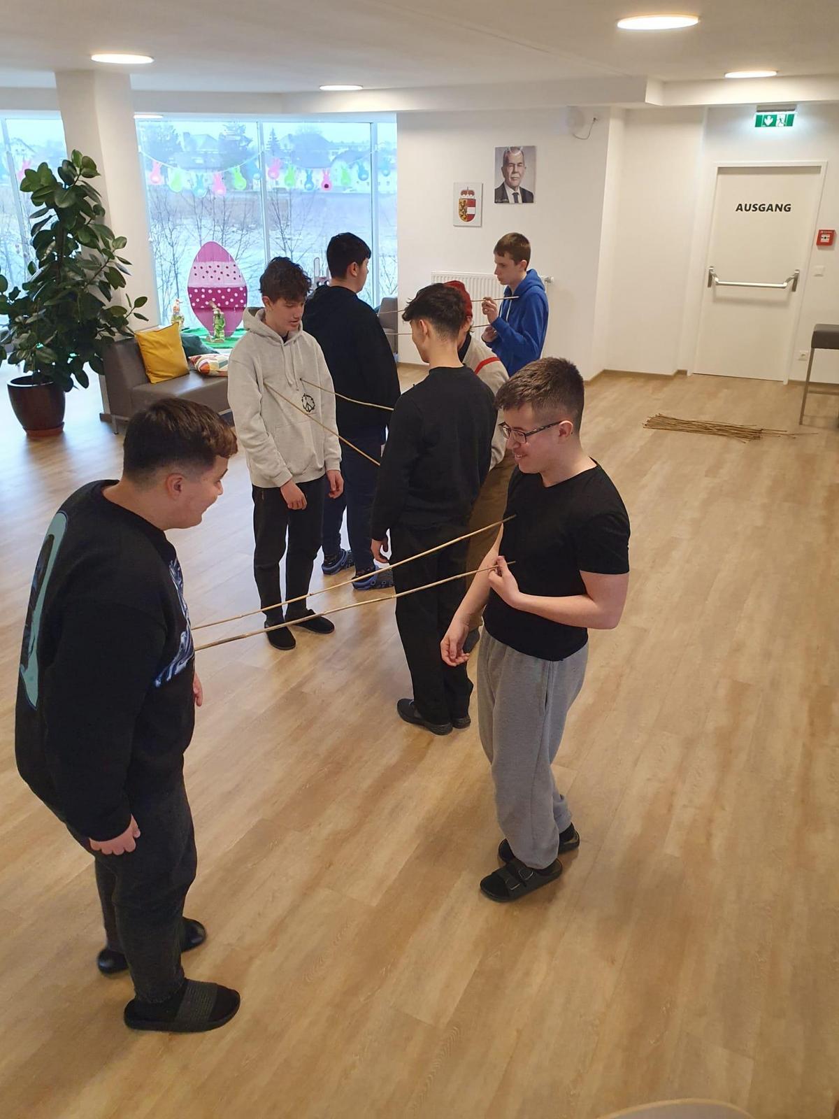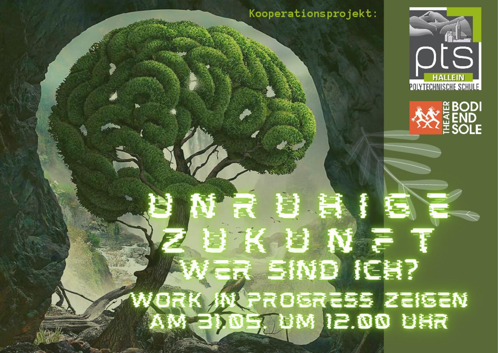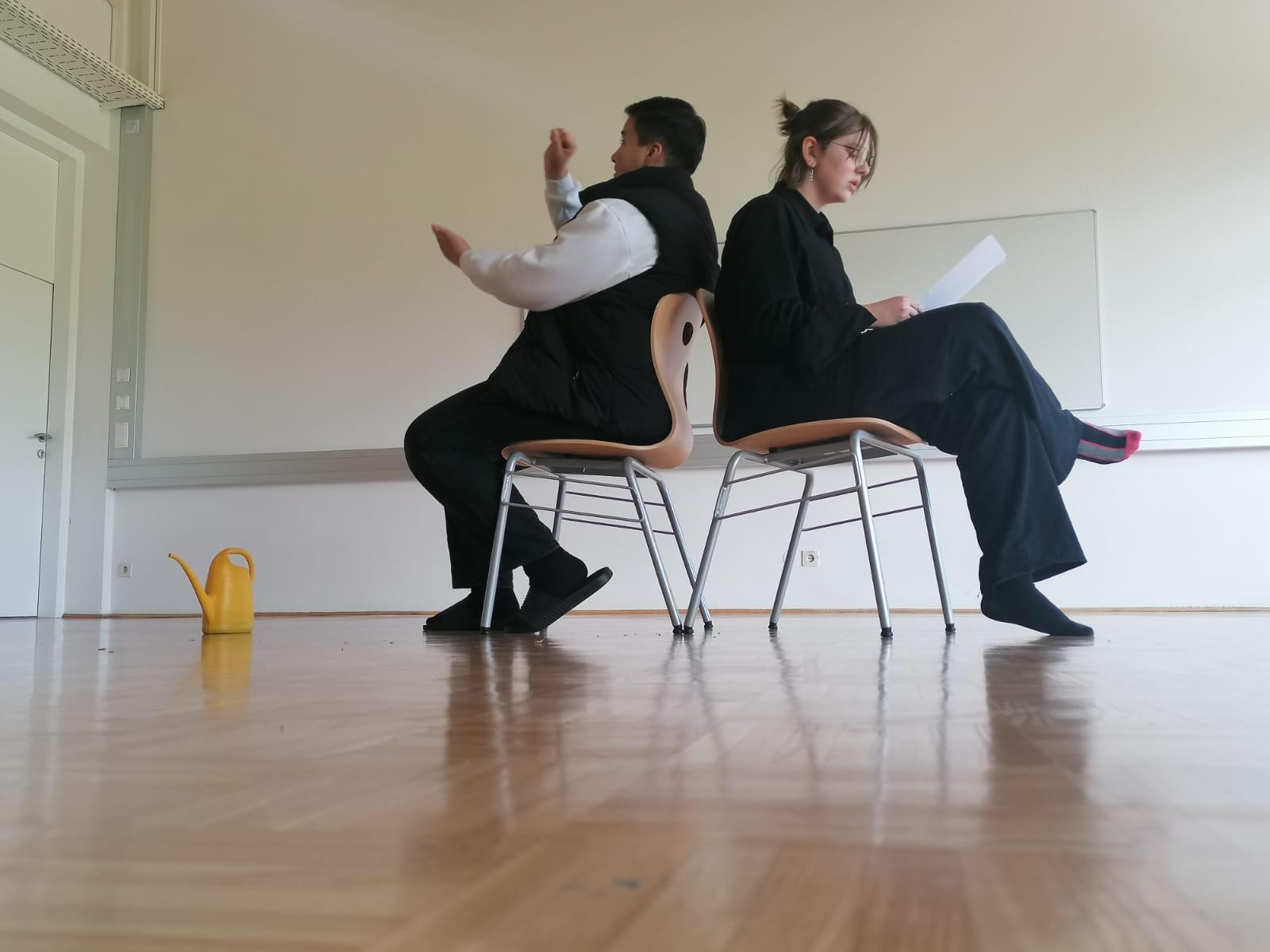 Das erste Treffen der beiden Workshopleitenden Dominik Jellen (Theaterpädagoge und Schauspieler) und Marena Weller (Tanzpädagogin und Performerin) mit den 35 Schülerinnen und Schülern der PTS Hallein fand am Ende Februar statt. Bis zu den Osterferien kam es zu insgesamt vier weiteren Treffen mit der gesamten Gruppe, jeweils am Dienstag Vormittag. In diesen Treffen, in denen zu Teilen mit der ganzen Gruppe gemeinsam und zu Teilen in Kleingruppen gearbeitet wurde, erarbeiteten und vertieften die Workshopleitenden mittels theaterpädagogischen Gruppenübungen die jeweiligen persönlichen Interessen und Gedanken der Schüler/innen zum Thema Umwelt und Verwandtschaft. Methoden und Übungen des kreativen Schreibens unterstützten die Schüler/innen dabei, ihre ersten eigenen Texte für die Abschlussperformance zu erarbeiten.