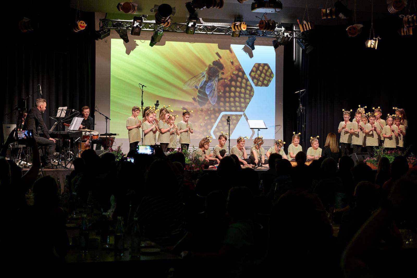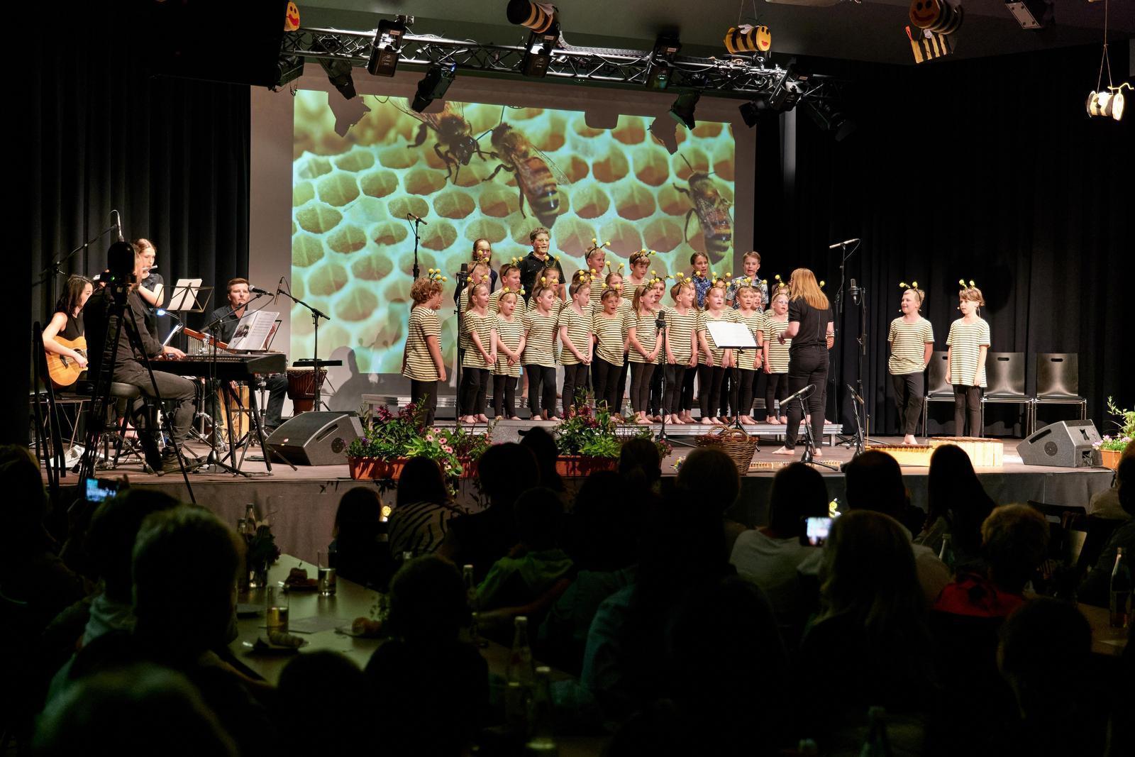 Am 14.06.2023 war es endlich soweit! Das lange Proben hatte ein Ende und die Schülerinnen und Schüler konnten das Musical "Bienenstark – wir brauchen euch alle" im ÖHA in Öblarn vor voll besetzten Reihen aufführen. Die Schauspielerinnen und Schauspieler sowie die Zuschauerinnen und Zuschauer tauchten gemeinsam in die Welt der emsigen Bienen ein und erfuhren viel Nützliches. Dabei halfen der "Imker Meyer" und seine Tochter Vicky. Die beiden Expertin und der Experte stellten z.B. die Aufgaben der Bienen vor und wurden dabei von Bienensummen und den groovigen Putzbienen begleitet. Der Kinderchor begeisterte das Publikum mit Liedern wie "Schlaft, ihr Larven", "Nektar aus der Blüte" und "Schwänzeltanz".