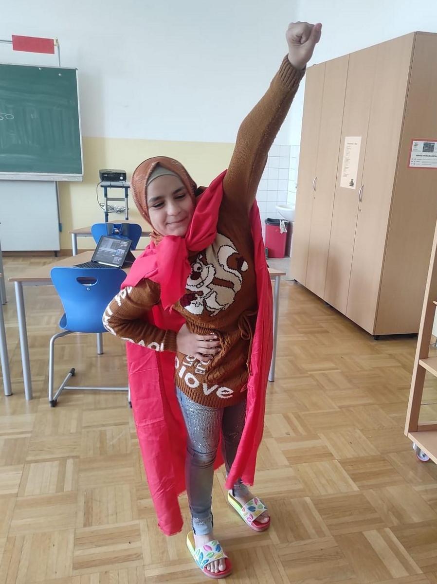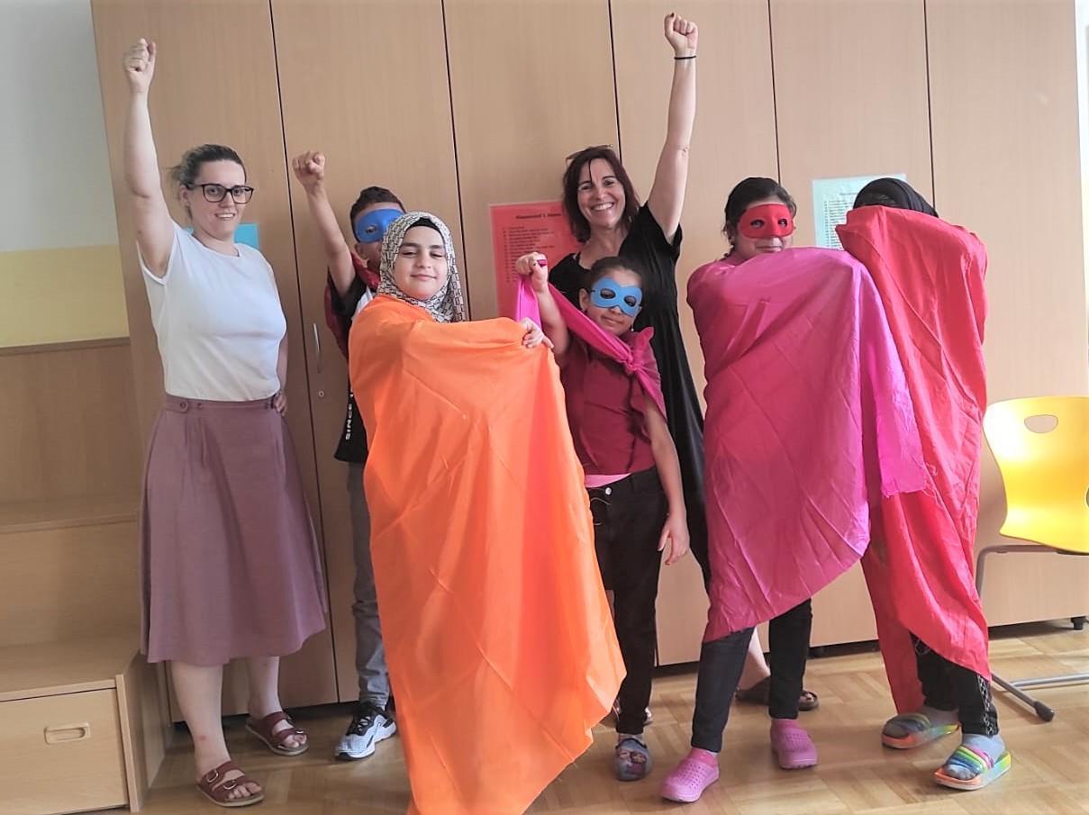 Die Theaterpädagogin stellte den Jugendlichen jede Woche verschiedenste Spiele und Übungen aus den Bereichen Wahrnehmung, Konzentration und Kreativität vor. Die Übungen und Spiele waren so konzipiert, dass man sie auch ohne Sprachkenntnisse in deutsch bald mitmachen konnte und dass sie Spaß machten. Der Schwerpunkt lag auf behutsamer Stärkung und Ermutigung. Die Jugendlichen konnten bald kleine Erfolgserlebnisse feiern. Sie wurden zum Beispiel in den Spielen, wo es um Reaktionsfähigkeit geht, immer schneller und sicherer. Sie fassten Mut und trauten sich, Miniszenen vor den anderen vorzuspielen. Die Theaterpädagogin lud die Jugendlichen nun ein, mit Powerposes oder anderen starken Posen zu experimentieren. Am Ende präsentierte sich jede und jeder Jugendliche stolz in einer kleinen Szene mit selbst gewählter Musik als Superheld/in.