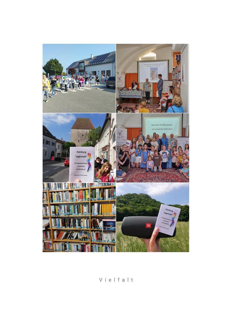 Zahlreiche Texte wurden von den Kindern in der Schule aufgenommen und per Padlet abrufbar gemacht, animierte Stories am Computer entwickelt (StoryboardThat), Bücher gelesen, Bücherkisten gestaltet, Autor und Illustrator Michael Roher kennengelernt, neue kreative Techniken (Monotypiegrafik) kennengelernt und die Mittelalterstadt Hainburg nach dem Besuch der Bibliothek mit einer Audiosagenwanderung entdeckt.