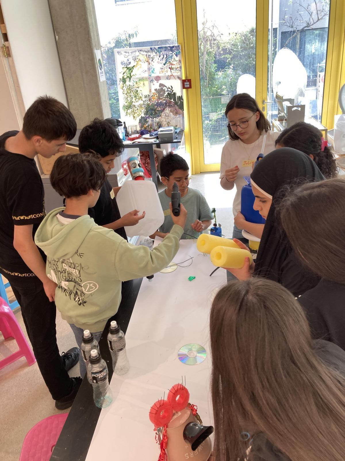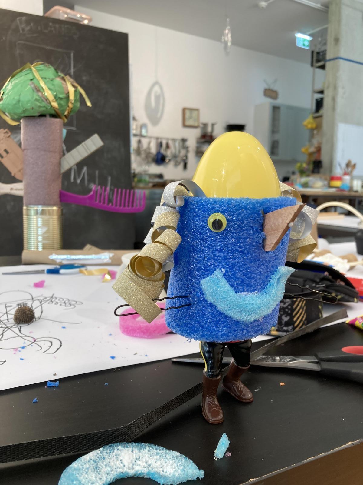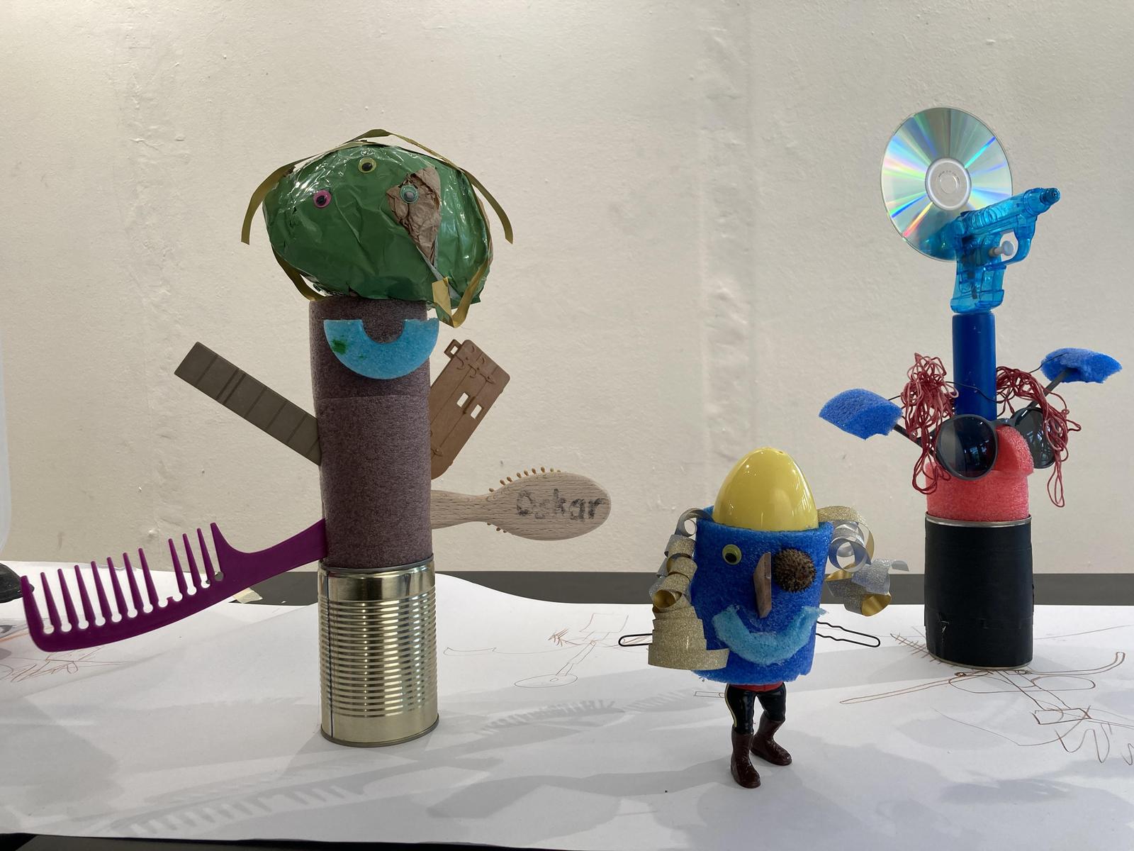 In Anlehnung an die gesammelten Materialien entwarfen die Schüler/innen vor Ort auf dem Papier erste Skizzen. Die Zeichnungen bildeten die Grundlage für die Annäherung und Auseinandersetzung mit den jeweiligen Materialien: aus was bestehen diese Materialien, welche Funktion hatten sie bisher, wie können sie neu zusammengesetzt werden, wie erhalten sie eine neue bzw. andere Verwendung? In mehreren Arbeitsschritten wurde zerlegt, geklebt und die verschiedenen Materialien zu neuen Objekten zusammengefügt.