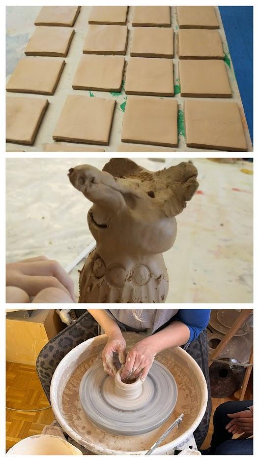 Im Werkstattteil (Atelier der Künstlerin, Atelier der ARTgenossen) durchliefen alle Kinder drei Stationen, um mit dem Werkstoff "warm" zu werden. Mit Nudelwalker, Kachelform und Ton stellten die Kinder ihr Arbeitsmaterial für das Relief her. Aus der Hand formten sie Skulpturen und gestalteten die Oberflächen mit unterschiedlichen Strukturmaterialien. Und die Arbeit einer Keramikkünstlerin lernten sie hautnah im Atelier der Künstlerin kennen. Arbeiteten auf der Drehscheibe, konnten Keramikwerke bestaunen, kleine Amulette fertigen und viele Fragen zur Keramikkunst stellen.