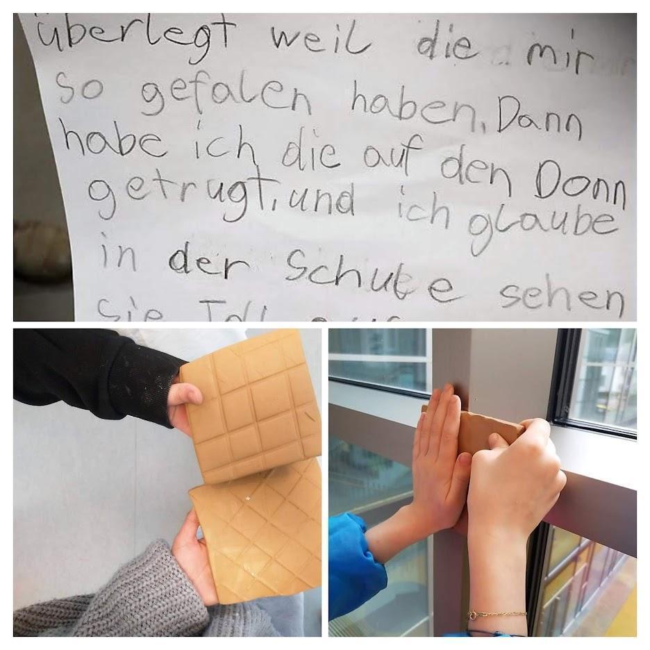 Ton ein archaisches Material – mit Händen und Körpereinsatz entstehen Formen! Schmutzige Hände, Krafteinsatz und Gestaltungsfreude gehören dazu – diese Erfahrungen sind elementar und lohnen sich. Wir setzten das Material großflächig, individuell und gemeinschaftsfördernd ein! Es entstanden Miniskulpturen für die Kinder zu Hause und ein Gemeinschaftswerk, das in der Schule verbleibt.