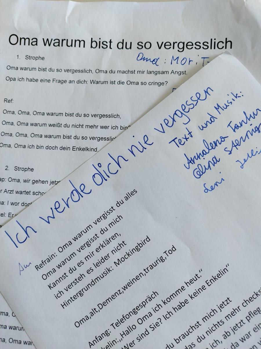 Die im Comic behandelte Geschichte wurde von den Schüler/innen weitergezeichnet und großformatig, im Sinne einer Collage zusammengestellt. Diese Erzählungen wurden schließlich mit verschiedenen Materialien dreidimensional in einem Marmeladenglas zu einer "Erinnerungsmarmelade" verarbeitet und für die Ewigkeit konserviert. Bei "Songs for my Granny" wurden einfache Texte, die das Thema Demenz behandeln, gestaltet. Aus diesen bestehenden Liedern wurden Songs kreiert, die bei der Präsentation aufgeführt wurden.