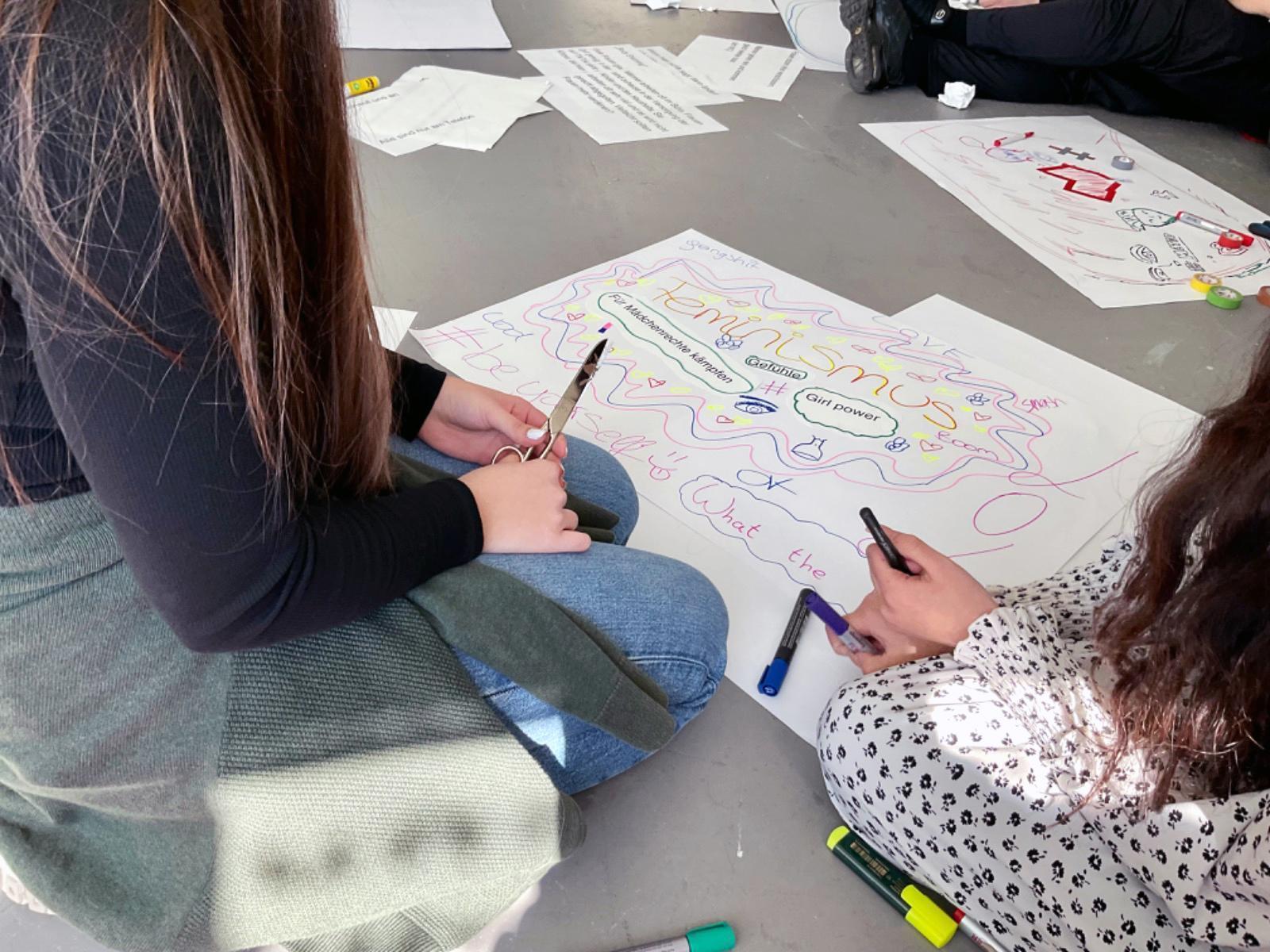 "ich.du.er.sie.es.wir – Die Genderwerkstatt" lud Schüler/innen der 4. Klassen der MS 11 Diesterwegschule dazu ein, ihre Alltags- und Lebenserfahrungen als Ressourcen für kreative Feminismus-Forschung zu nutzen. Die Jugendlichen erkundeten gemeinsam mit einer Kunstvermittlerin der Museen, einer Künstlerin und dem Sozialarbeiter der Schule die Ausstellung "What the Fem*? Feministische Perspektiven 1950 bis heute" im Stadtmuseum Nordico und thematisierten Rollenzuschreibungen im Lentos Kunstmuseum. Bei einer Exkursion in ein Einkaufszentrum erforschten sie mittels Gesprächen und Zeichenübungen Genderfragen zu Werbung, Körpersprache, Alltag und öffentlichen Raum.