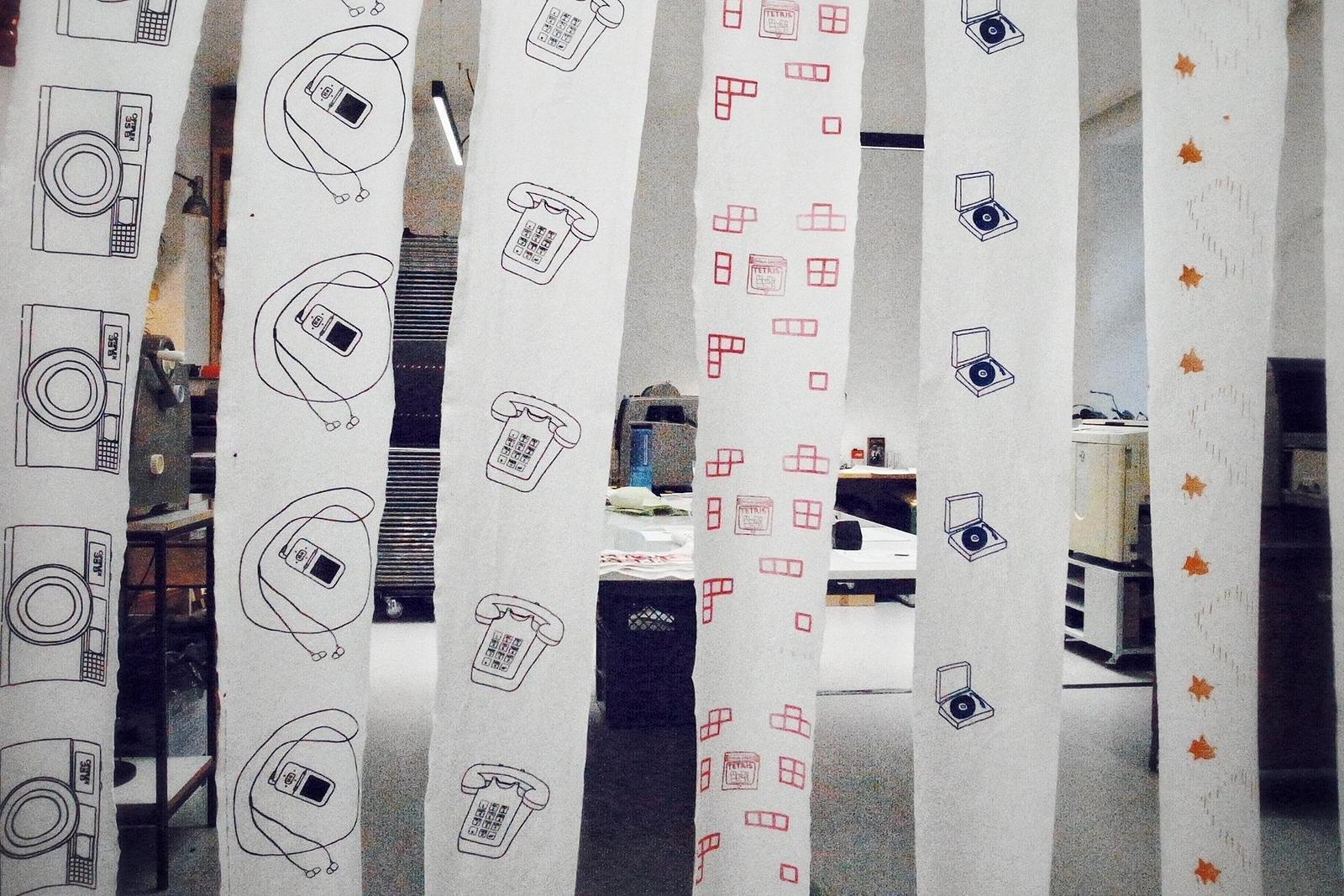 Das Endprodukt veranschaulichte schließlich individuelle Objekt-Zugänge, technische Entwicklung und fragte kritisch nach Haltbarkeit und Nutzungsdauer, die Stoffbahnen wurden in der Schule ausgestellt und somit auch der Gemeinschaftsraum Schule bespielt.