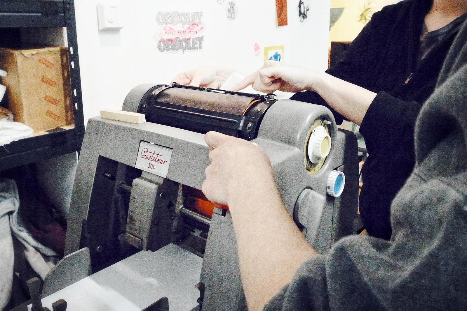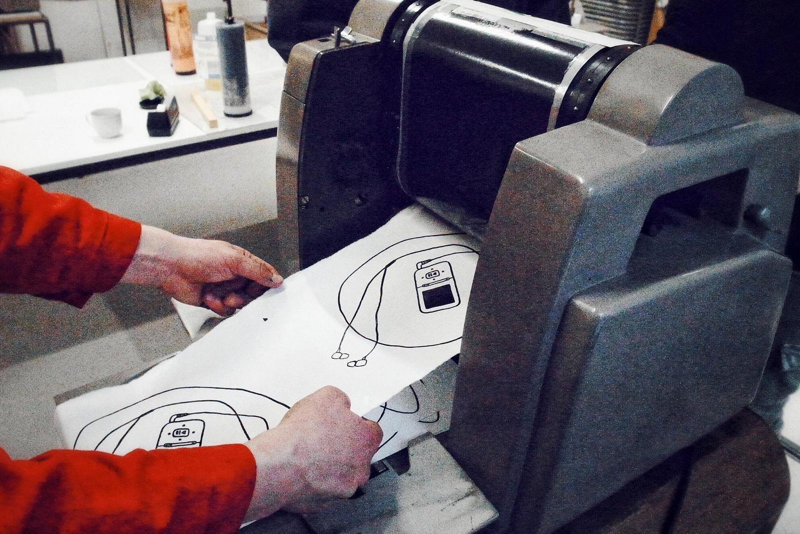 Der inhaltlichen Auseinandersetzung mit Obsoleszenz im Kassenraum (erste Workshopeinheit) folgte die technische Umsetzung via analoger Vervielfältiger (Mimeographen) im Studio (zwei Workshopeinheiten). Der Workshop gab Einblick, wie eine veraltete Drucktechnik (Schablonendruck) im Heute eingesetzt werden kann. Die gewählten Objekte wurden auf drei Ebenen dekonstruiert: Stofflichkeit/Oberfläche (Frottage), Formen/Erscheinung (Zeichnung), Zuschreibung/Objektgeschichte (Text) und dann auf Stoffbahnen gedruckt.