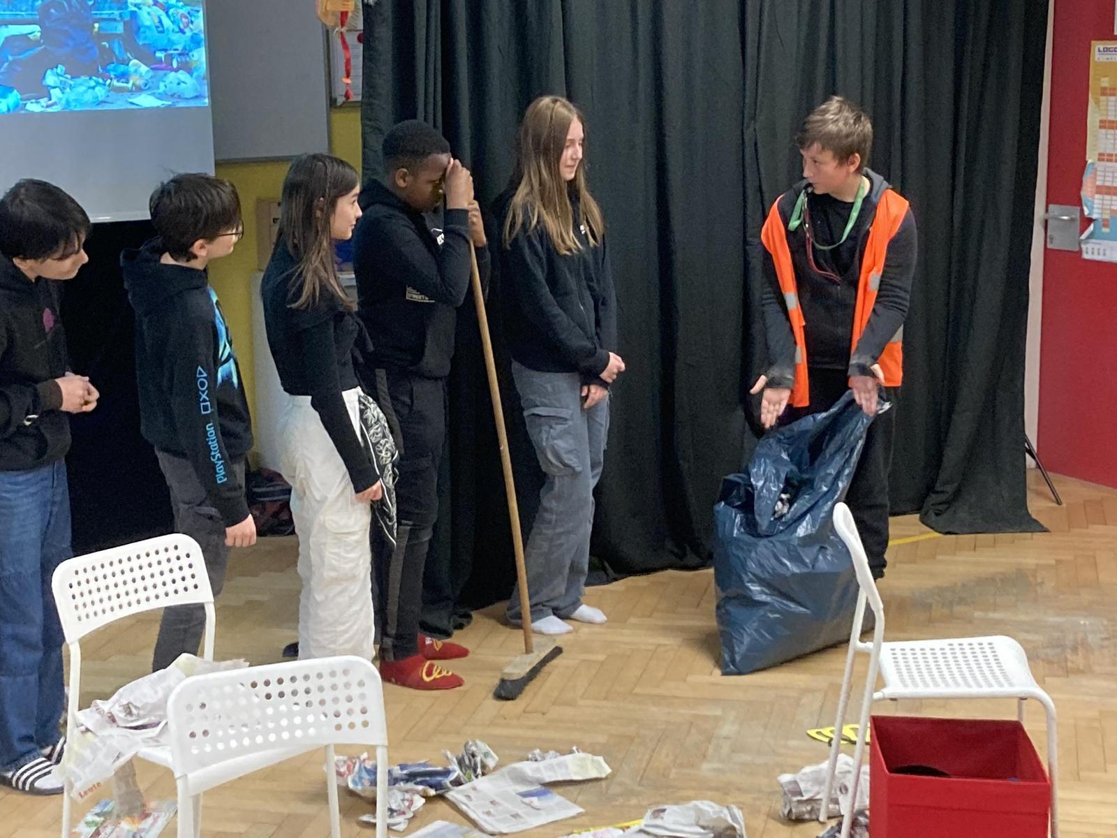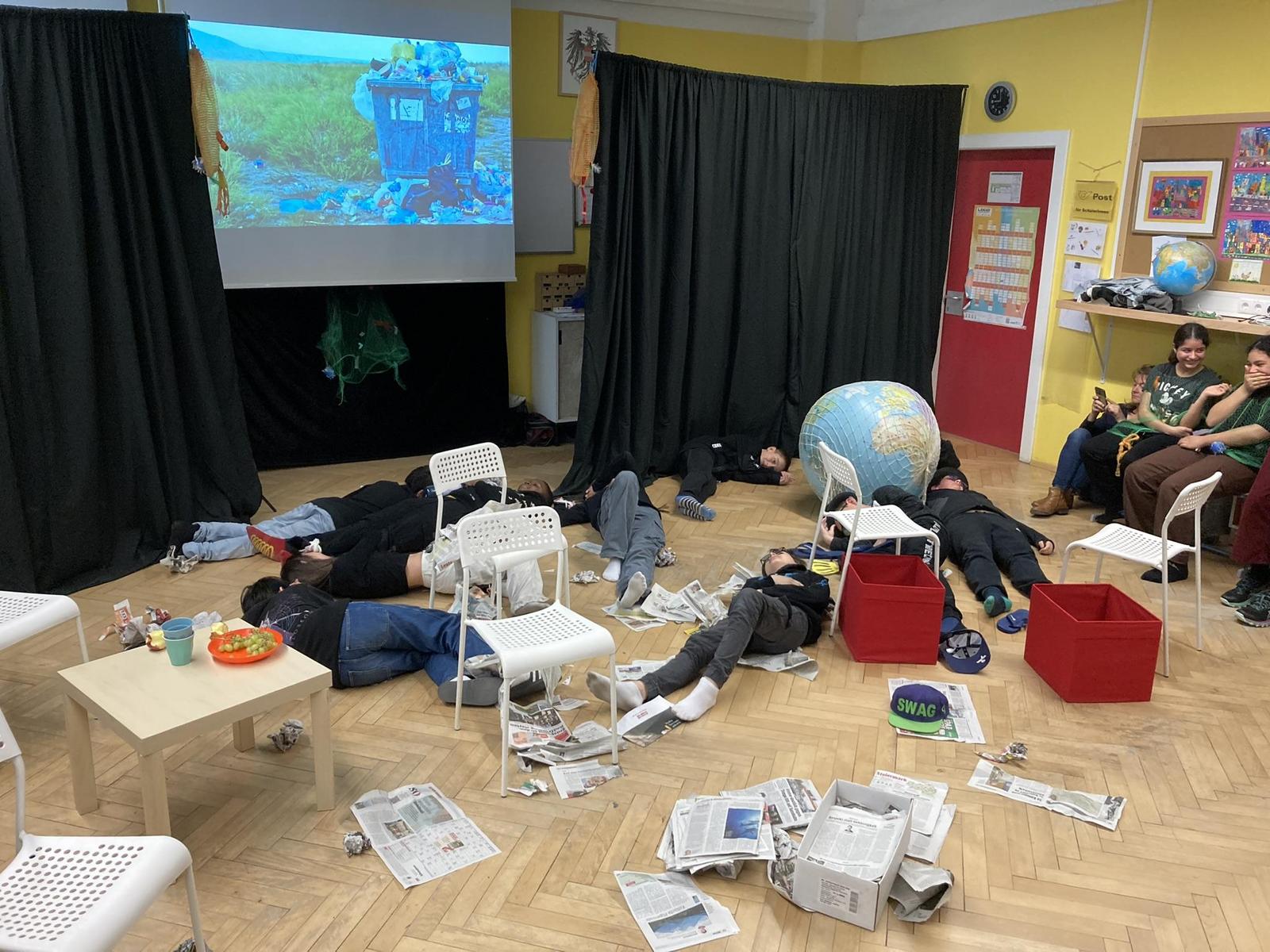 Unterstützt wurde die Theater- und Tanzgruppe der Klasse von einer Upcycling Gruppe, die Kostüme sowie das Bühnenbild gestaltete. Nach intensiven Proben, Probieren und Experimentieren wurde das Stück für Gäste aus der Klasse 1a aufgeführt.