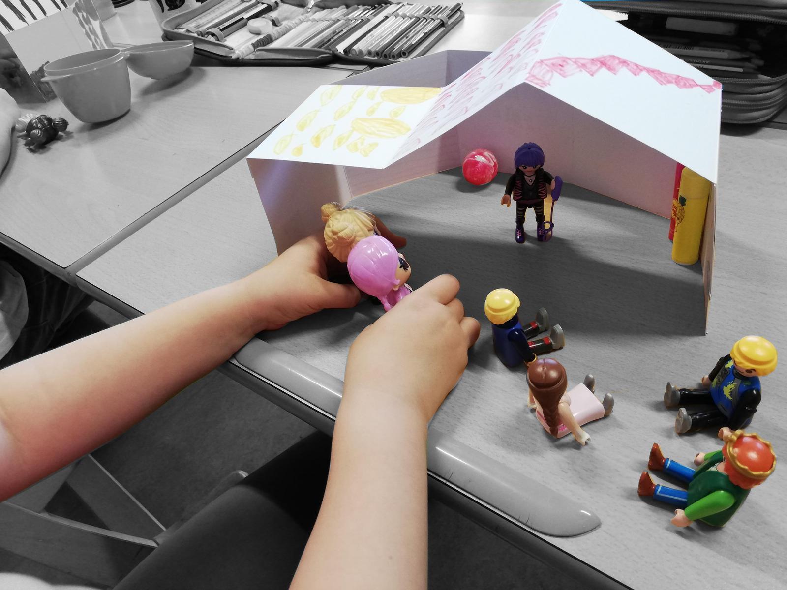 Aus den entstandenen Papierformaten wurden am Ende kleine Gebäudemodelle gebaut und mit eigenen mitgebrachten Figuren bespielt.