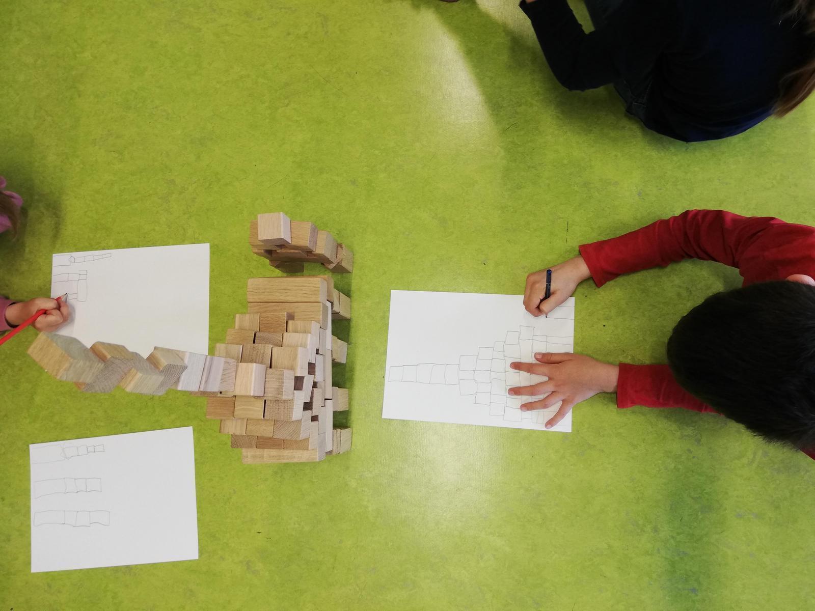 Bauwerke aus Bausteinen werden errichtet und skizziert: