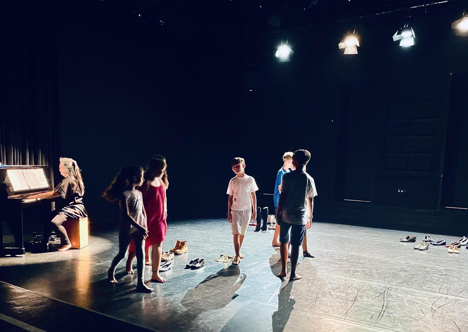 Die ersten beiden Tage waren ganz im Sinne des Toihauses der Improvisation gewidmet, wo die Kinder lernten, wie man auf der Bühne ohne Scheu improvisieren kann. Schon in der Improvisationsphase wurden Elemente des diesjährigen Toihaus-Themas "Flüssigkeiten" aufgegriffen und eingearbeitet: Wie kann man gemeinsame und individuelle Wege musikalisch und tänzerisch darstellen? Wie sieht es aus, wenn Kinder einen Weg zusammen gehen, alleine gehen, als Gruppe gehen? Welche Schuhe braucht man für eine Reise? Nach und nach erarbeiteten die Künstlerinnen eine Choreografie mit den Elementen der Improvisationsübungen und mit Tanzelementen, bei denen die genannten Themen aufgegriffen wurden. Auch die nächsten Tage waren kein stures Einüben einer vorgegebenen Choreografie, sondern ein abwechslungsreiches Programm von Improvisation, Ausdruckstanz, theaterpädagogischen Übungen, die alle in eine Choreografie einflossen.