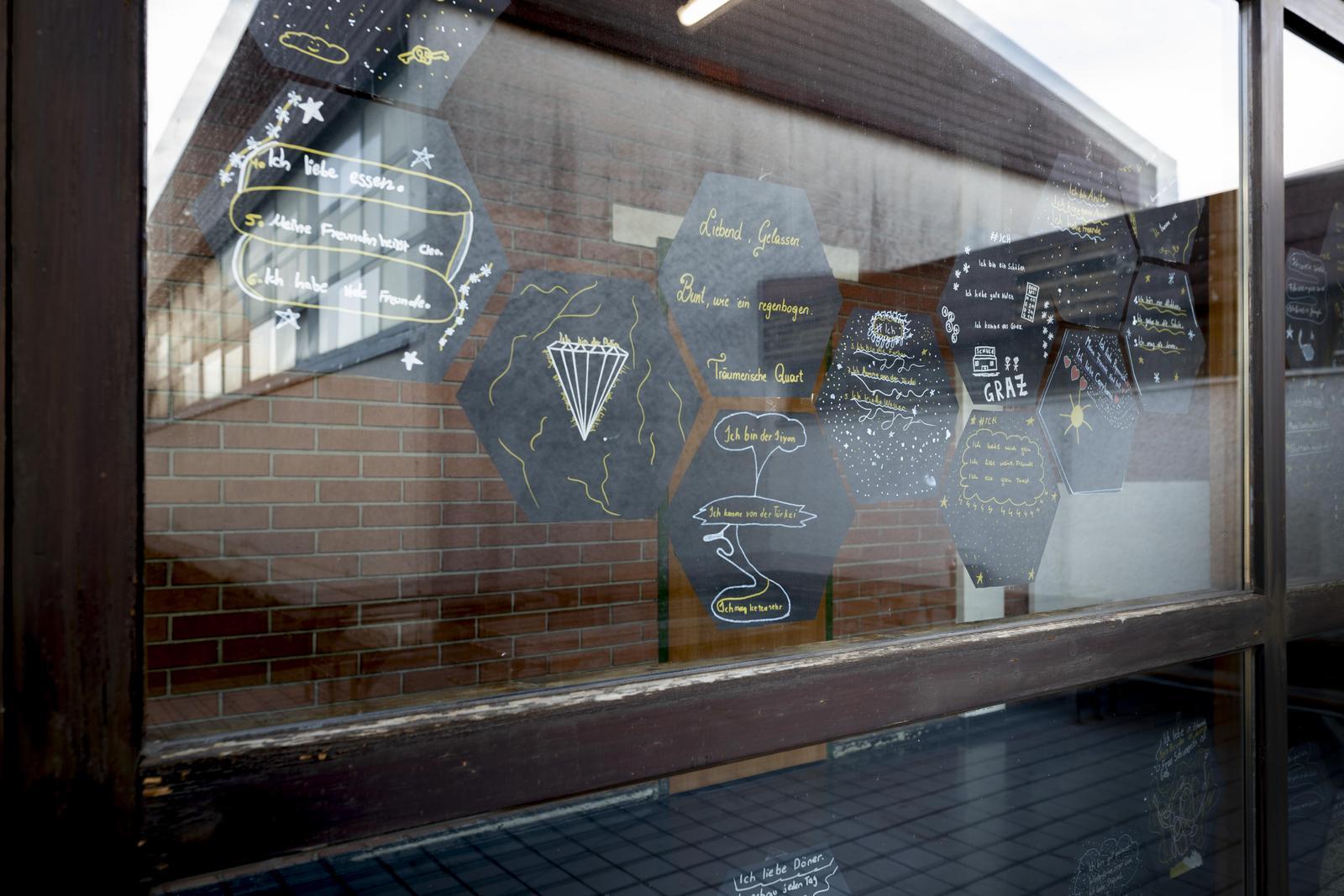 Nun folgt die Darstellung des 'Ich' mit künstlerischer Unschärfe in Form eines Haikus. Zunächst werden der Haiku als Gedichtform vorgestellt und gemeinsam Beispiele gelesen. Anschließend schreiben die Schüler/innen einen Haiku über ihr 'Ich' auf ein zuvor konstruiertes und ausgeschnittenes Papier-Hexagon. Durch das Aneinanderreihen dieser Hexagone ergibt sich eine 6 Meter lange Wandinstallation der Diversität, in der die vielen 'Ichs' ein 'Wir' definieren.