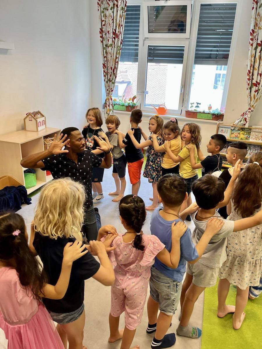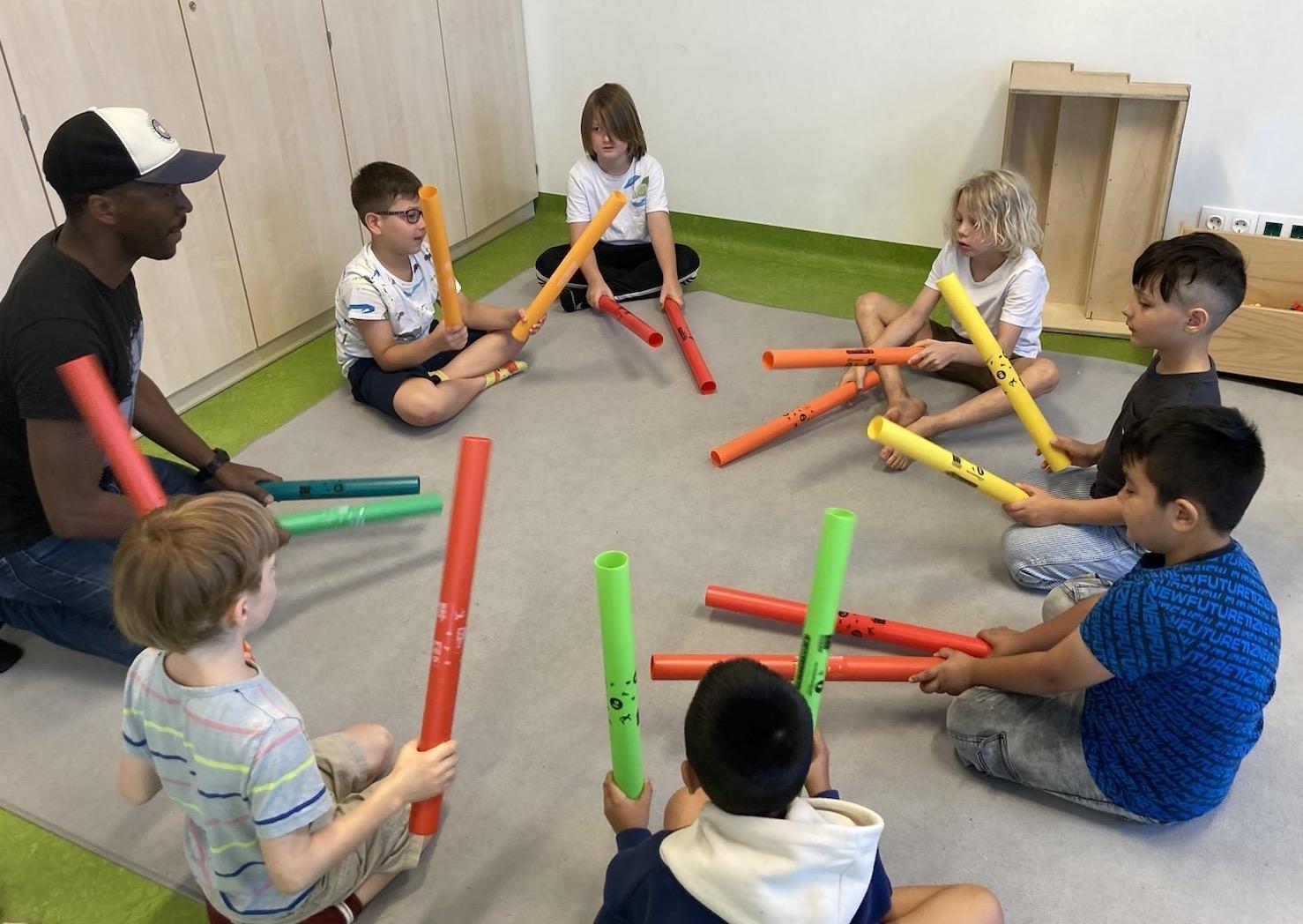Mit Verwendung von Body Percussion und von Perkussionsinstrumenten (Maracas, Clave, Rasseln, Klangstäbe, Triangel, Bongos, Cajon, Djembe, Cowbells, etc.) und Tanz praktizierte der Künstler mit den Schüler/innen mit Methoden wie z.B.: "Call & Response", im großen Kreis sowie in Kleingruppen, Klatschspielen, das Aufeinander Hören, Interagieren und soziales Lernen.