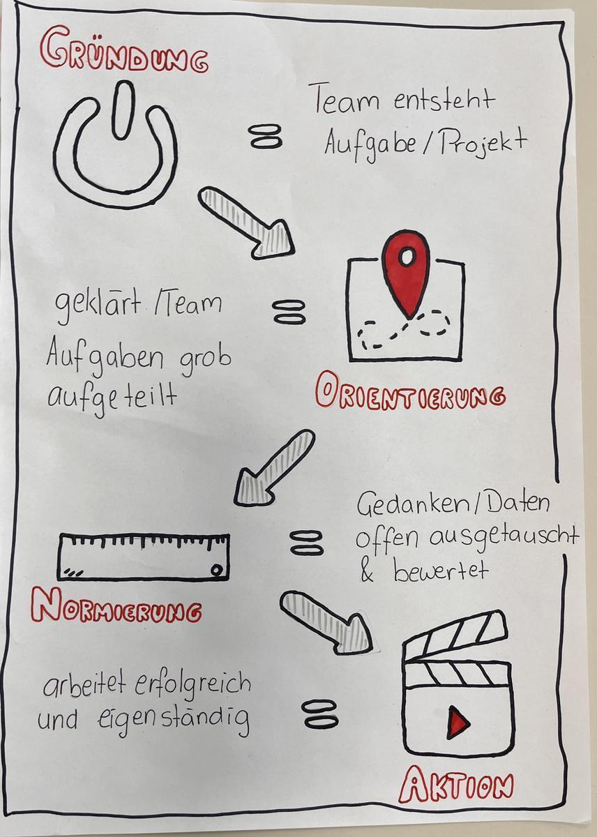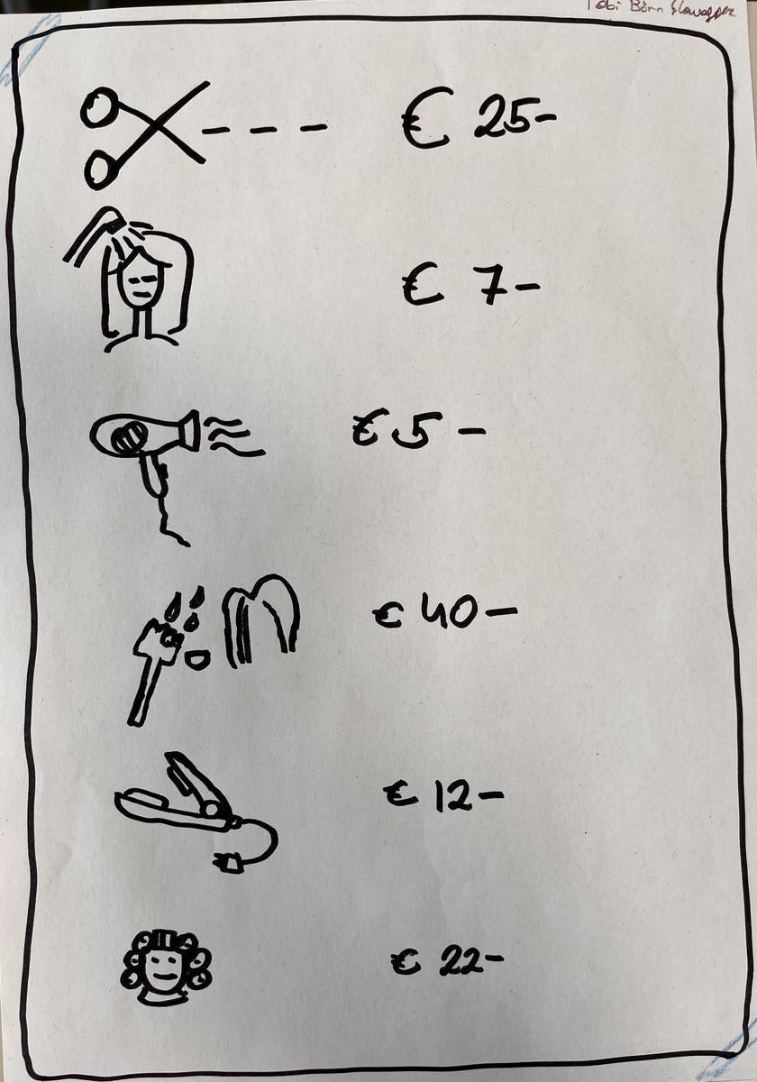 Gemeinsam mit den Schüler/innen wurden zu Beginn des Workshops die Themen festgelegt, die visuell umgesetzt werden sollten. Diese waren: Prozessvisualisierung für den Eingang und das Verarbeiten von Emails, Auspreisungstafel für einen Friseurbetrieb, Lebenslauf in visueller Form, Sicherheit am Arbeitsplatz, Phasen der Teamentwicklung. Die Grundlagen des visuellen Alphabets wurden vermittelt: einfaches Zeichnen von Symbolen, Menschen und Tieren, Umgang mit Blatteinteilung und Rahmen, Prozessvisualisierung mit Pfeilen, Personalisieren von Figuren, Emotionalisieren von Figuren und Gegenständen mittels Gesichtsausdrücken, Kodierung von Inhalten mittels Farbe, definieren von Key Visuals und herstellen von visuellen Hierarchien. Die Schüler/innen erarbeiteten sich ein visuelles Alphabet zur einfachen Gestaltung von ansprechenden Lernblätter.