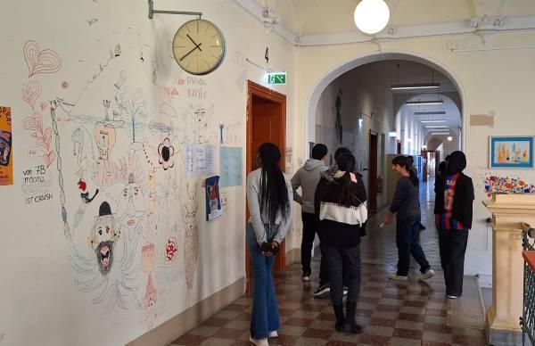 Ein RaumGestalten-Projekt aus dem Jahr 2022 "Zwischen(...)Raum. Aneignung durch temporäre Nutzung" hat seit seiner Durchführung weite Kreise gezogen. Angeregt von den damals entstandenen Gestaltungen im Schulhaus hatten sich seither sowohl Klassen im (Kunst-)Unterricht als auch Schülerinnen und Schüler individuell und informell an der Weiterführung beteiligt. Dabei sind künstlerisch interessante Gestaltungen mit starken Aussagen zu Jugendkultur, Politik, Klima etc. entstanden, aber teilweise auch vandalisch motivierte Kritzeleien.