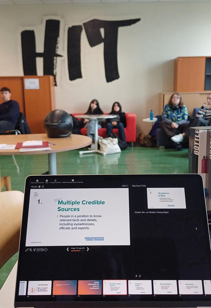 Dabei wurden sie von einem Journalisten und einer Expertin für kollaborative Lernformen begleitet. Wir starteten mit Zahlen & Fakten zur aktuellen Lage der Demokratie. Danach machten sich vier Kleinteams auf die Suche nach demokratischen Trends. Ziel der Feldforschung war es, Alltags-Trends aufzuspüren, die sich auf die Demokratielandschaft von morgen auswirken könnten. Konkret suchten die Schüler/innen nach Hinweisen zu den von ihnen gewählten Themen Mobilität, Zugang zu Information, Sprache und Konsumverhalten. Die Schüler/innen wurden dazu angehalten, ihre Daten kritisch zu hinterfragen und auf Relevanz zu prüfen. Die Trendberichte wurden schließlich in Form von Videos, Stories und multimedialen Darstellungen übermittelt.