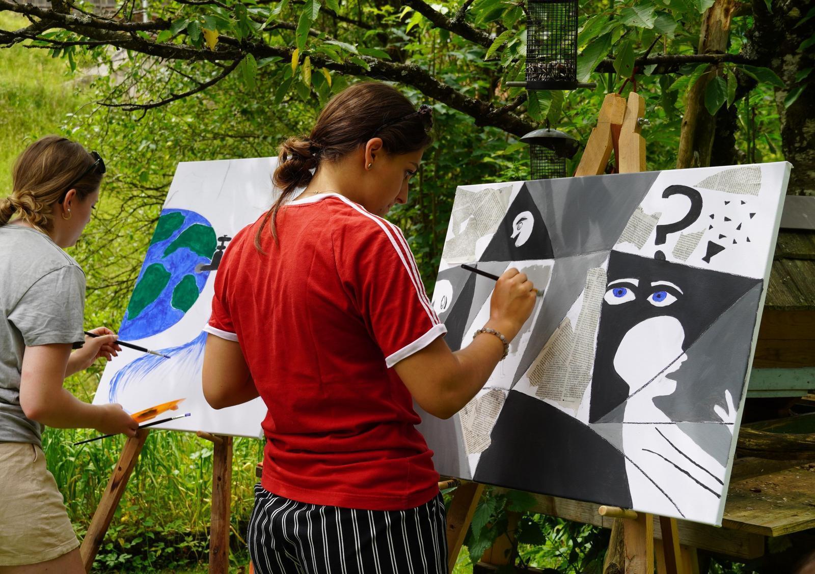 Ein weiterer Projektteil widmete sich den Menschenrechten. Die Schüler/innen beschäftigten sich mit einzelnen Artikeln und sammelten Ideen, die sie zunächst als Skizzen auf Papier und anschließend mit Farbe auf die Leinwand brachten. Dies geschah im Atelier und im idyllischen Garten der Malerin H. Gollnhuber, wo im Schatten der Bäume und beim Plätschern eines Baches in ruhiger Atmosphäre tolle Bilder entstanden.