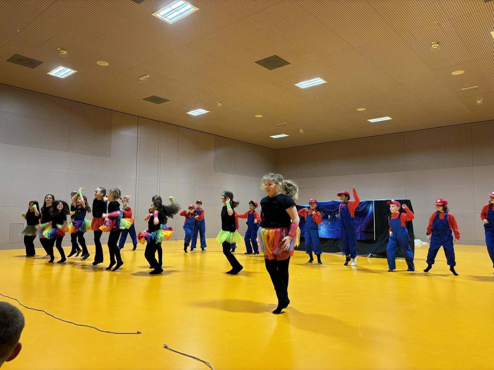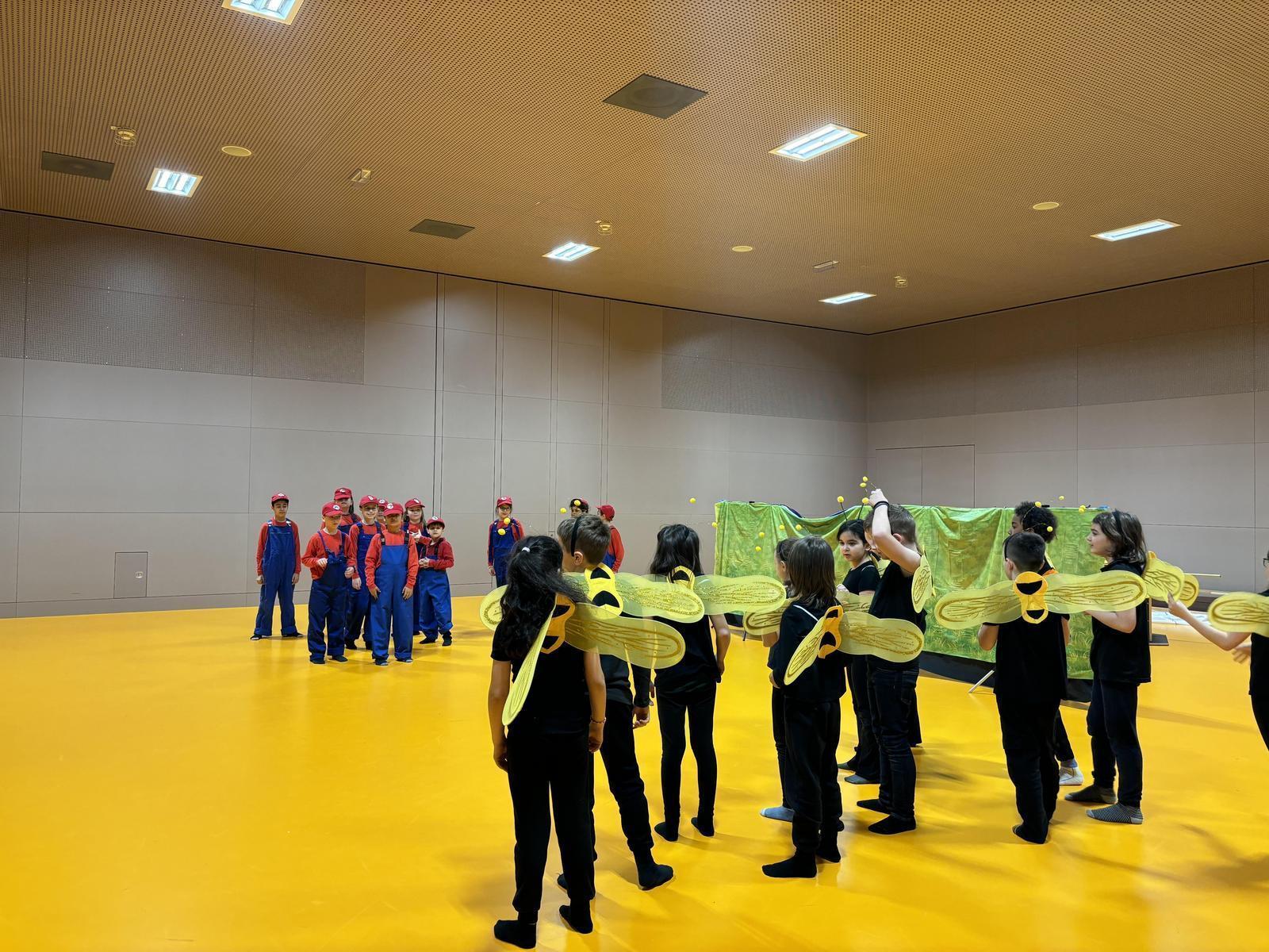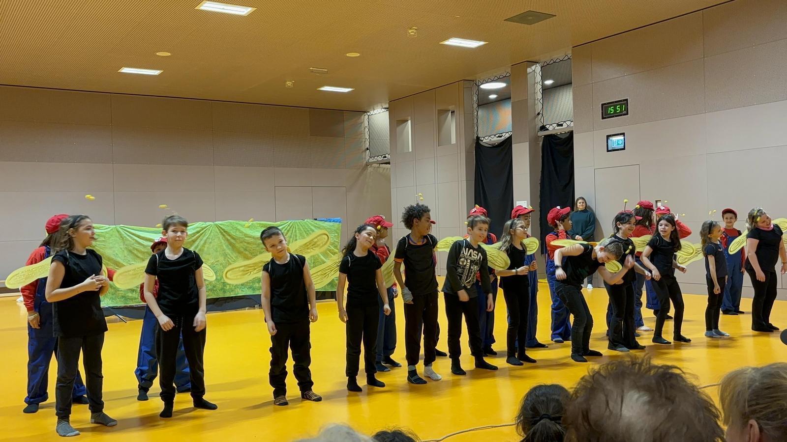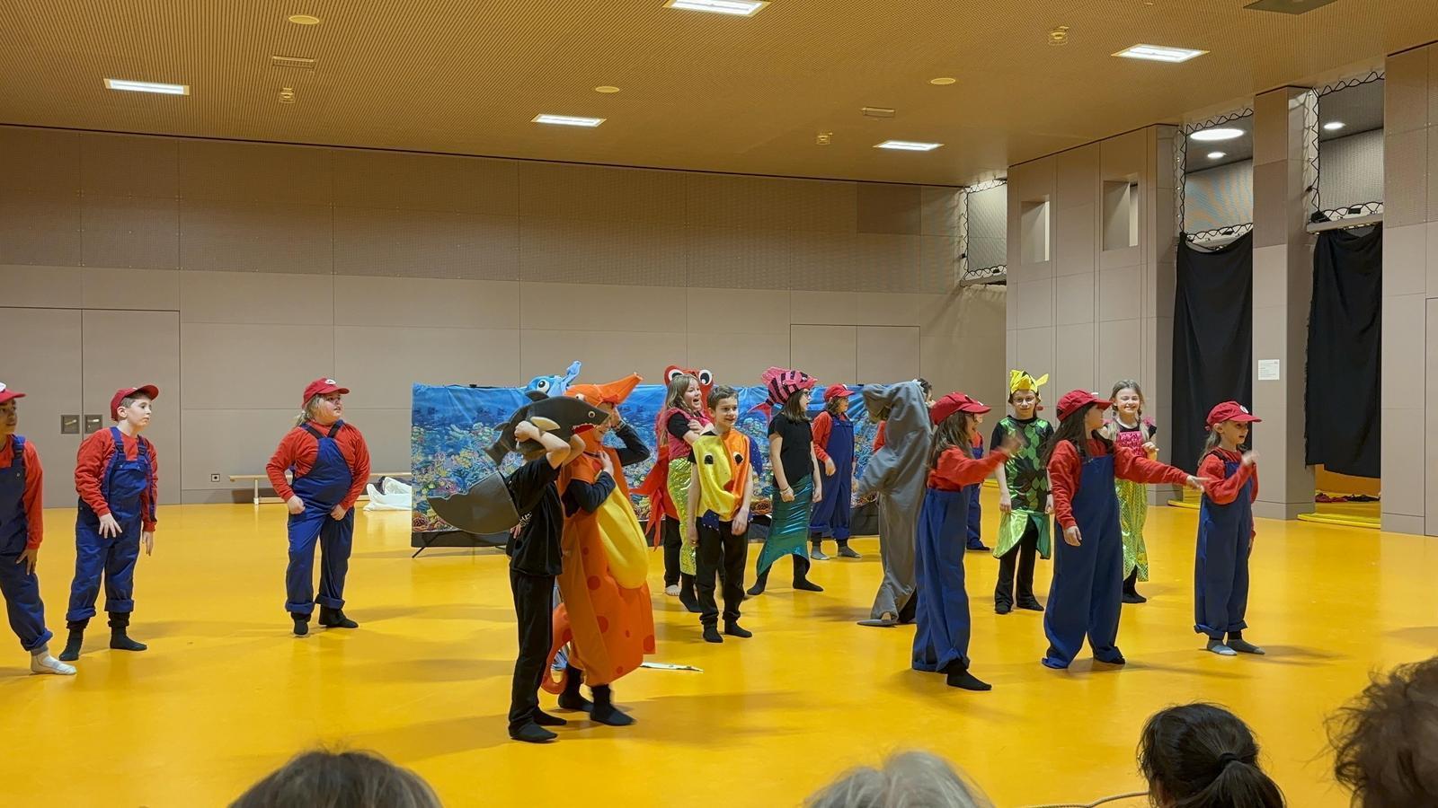 Im Stück wurden die Schüler/innen bei einer Geburtstagsparty in ein Super Mario Spiel hineingezogen, mussten zusammen Herausforderungen meistern und Levels schaffen, die dazu beigetragen haben die Umwelt zu retten. Auf dieser abenteuerlichen Reise haben die Super Marios auf Bienen, Unterwassertiere und die Disco Girls getroffen.