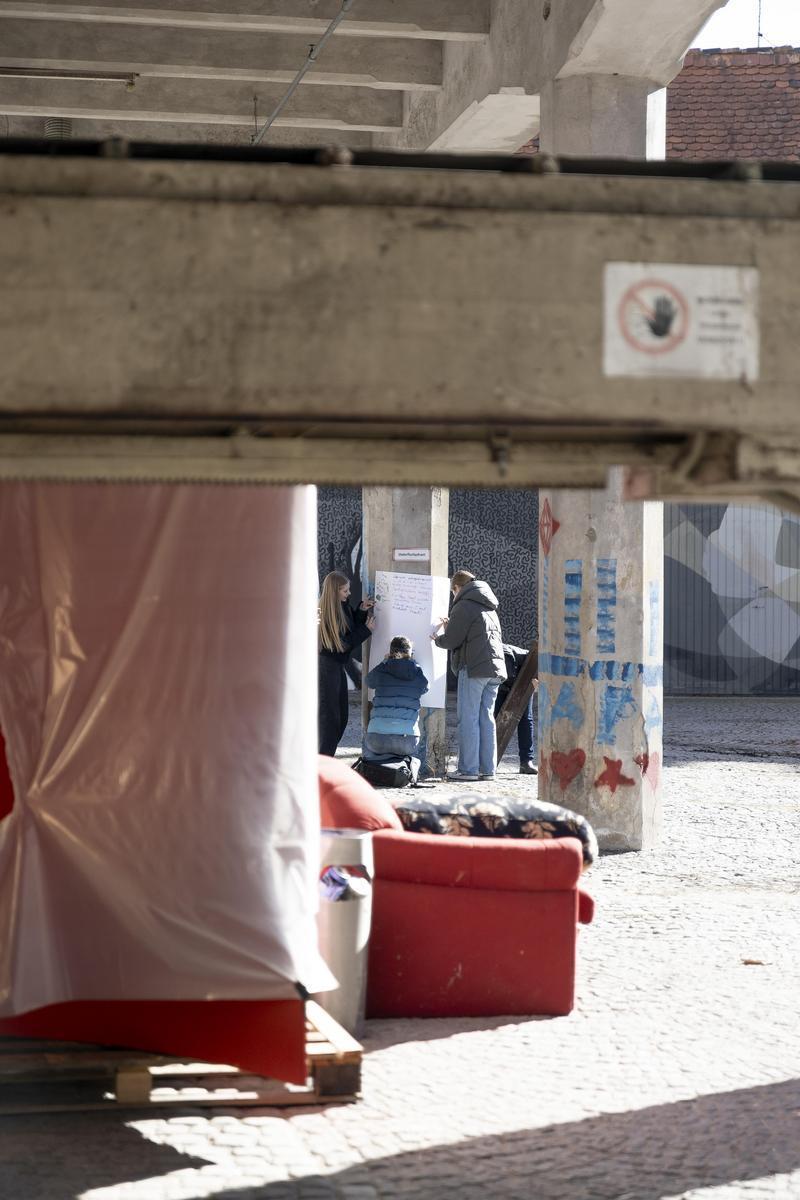 In einem weiteren Teil wurden Stimmen aus der Umgebung gesammelt, Hoffnungen, Wünsche und Ideen, damit der Ort endlich wieder wird. Als Zwischenergebnis entstand ein künstlerisches Mapping, welches den Ort aus mehreren Perspektiven beleuchtete – eine Sammlung von Erinnerungen, Sackgassen und Auswegen.