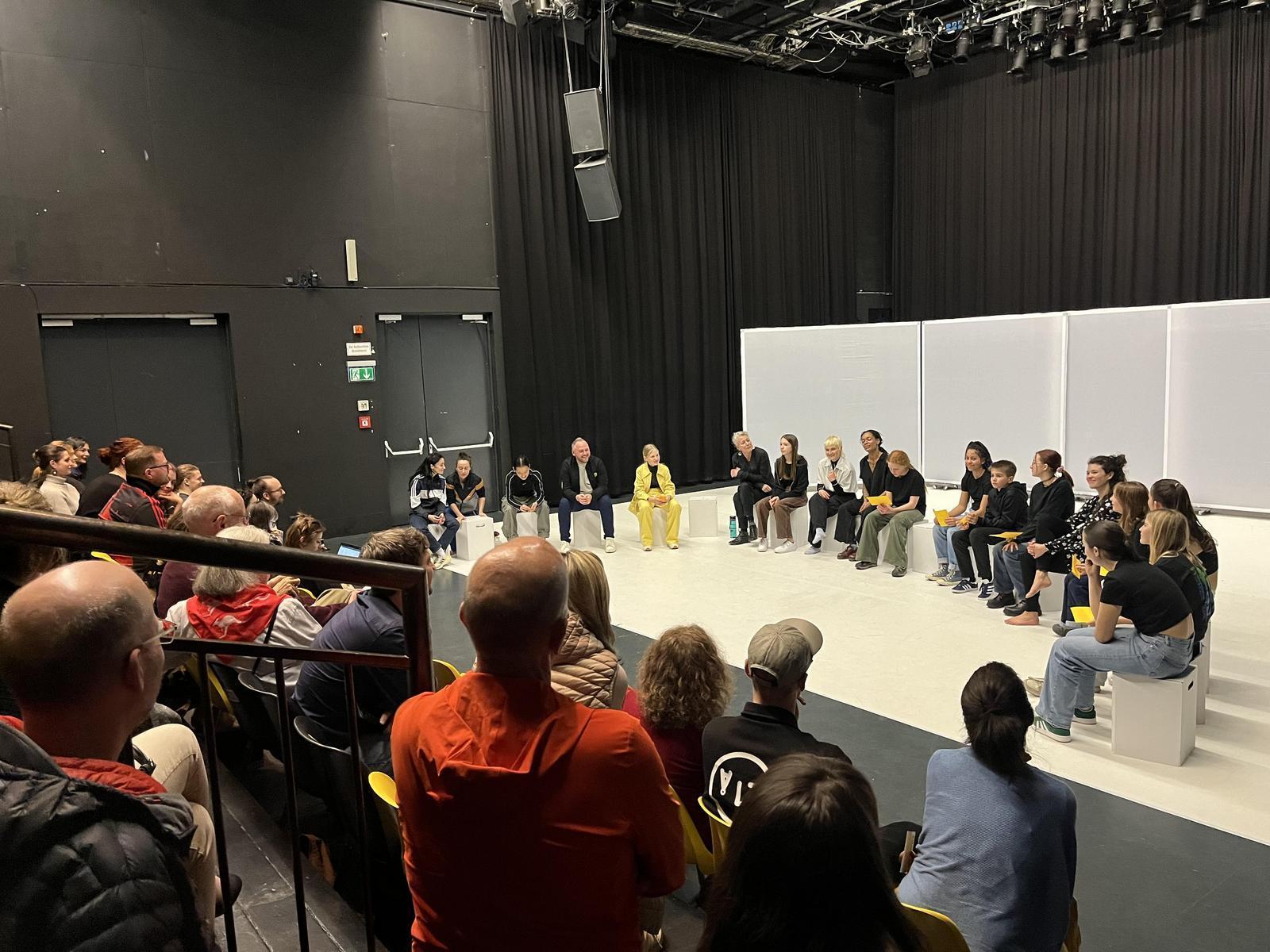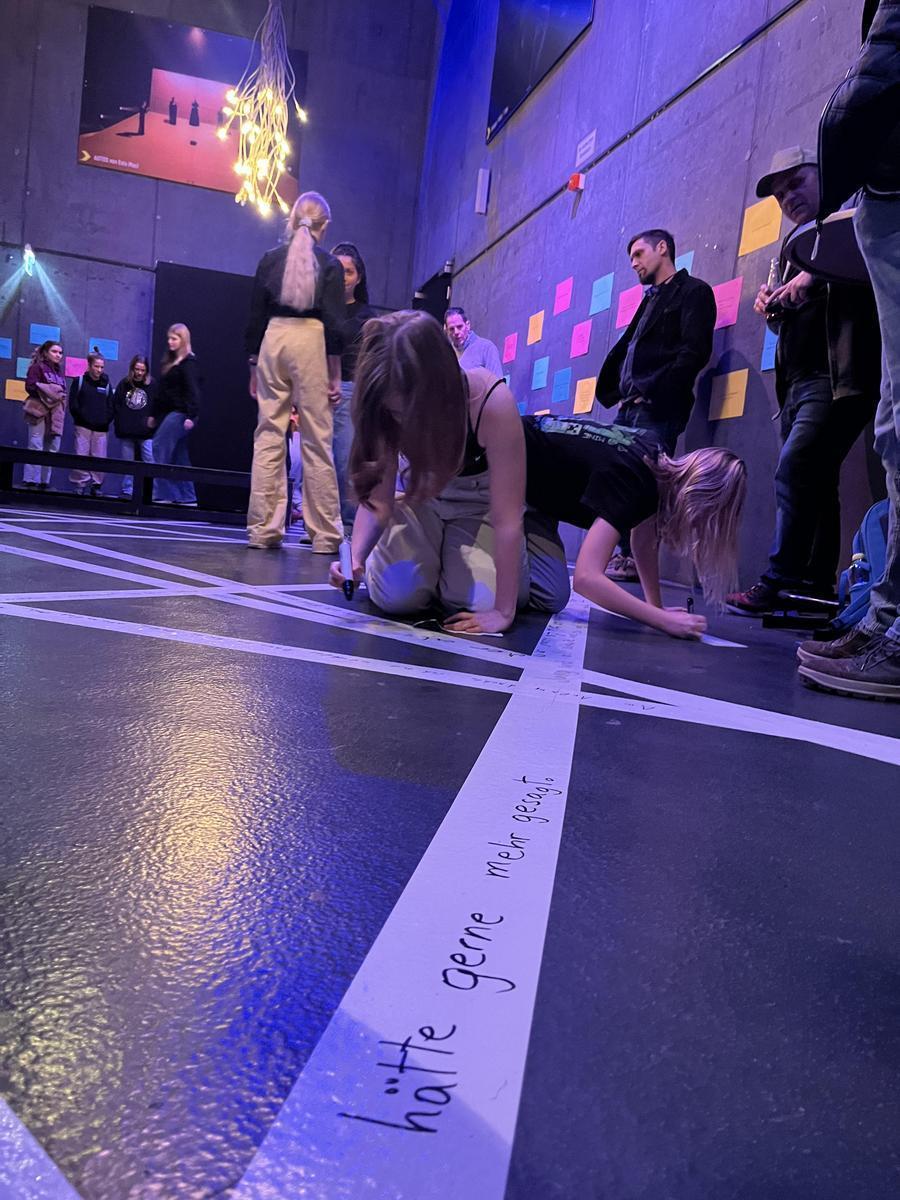 In einem weiteren Schritt ging es dann von der Schule nach draußen: Wie fühlt es sich an, diese Standbilder in der Stadt Salzburg zu performen? Wie reagiert das Umfeld auf diese Interventionen? Basierend auf diesen Erkenntnissen und Erfahrungen entwickelten wir schließlich gemeinsam eine Performance, welche direkt vor den 'Songs of Absence' im Foyer der ARGEkultur zu erleben war. Den Abschluss bildete ein Publikumsgespräch zwischen Anna Konjetzky, ihrer Company und den Schülerinnen und Schülern – geleitet von den Schülerinnen und Schülern.