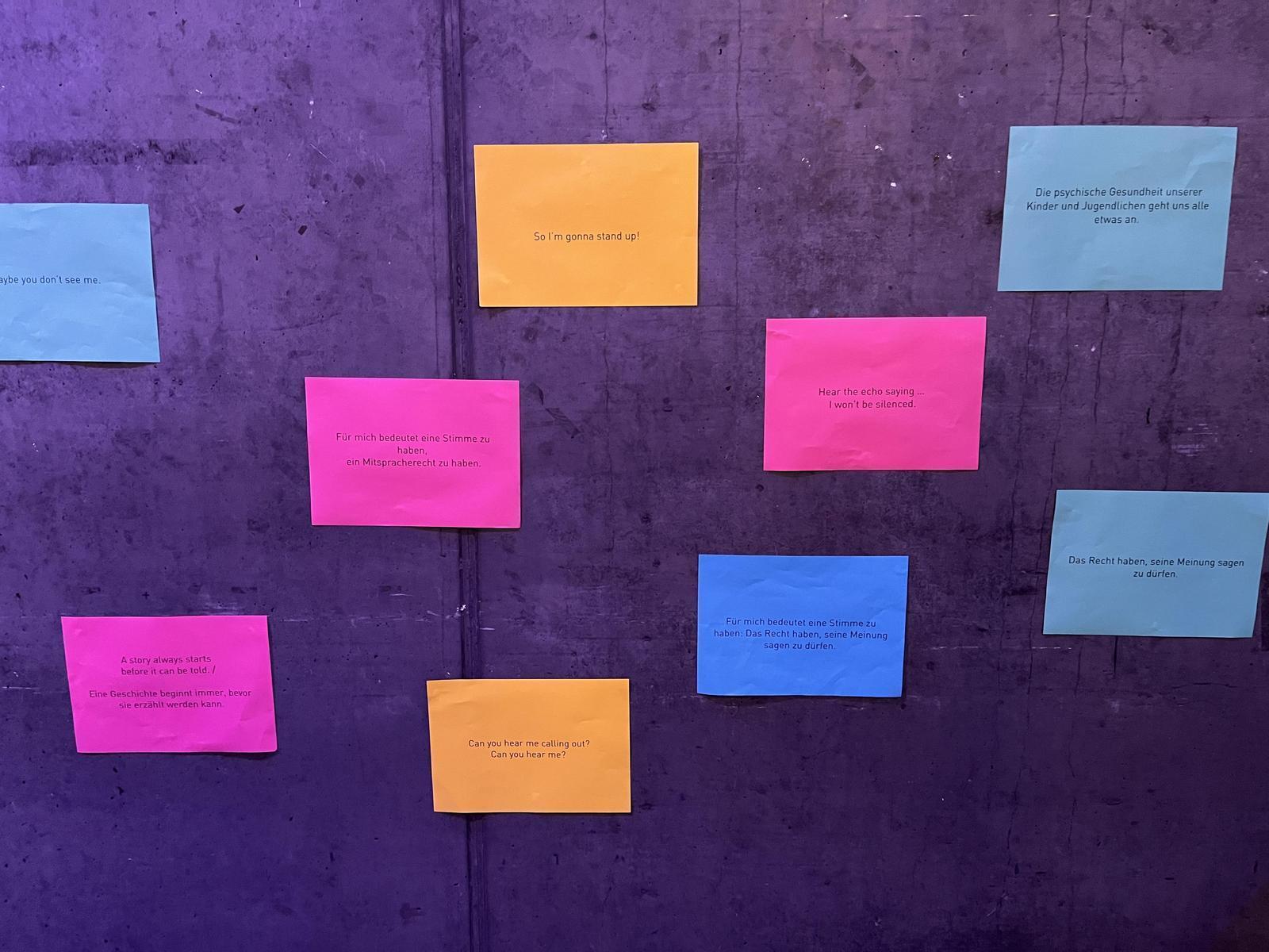 Die Schüler/innen der 3. Klasse des Musischen Gymnasiums Salzburg beschäftigten sich zunächst damit, bei welchen Themen sie kaum gehört wurden, obwohl sie direkt davon betroffen waren – etwa beim Thema psychische Gesundheit oder der Gestaltung von Schule und Unterricht. Gehört, wertgeschätzt und gesehen zu werden, ohne davor eine bestimmte Leistung erbringen zu müssen, war den Schülerinnen und Schülern ein wichtiger Punkt. Ausgehend von diesen Erkenntnissen formulierten sie empowernde Erwiderungen und setzten diese in Standbilder bzw. performative Aktionen um.