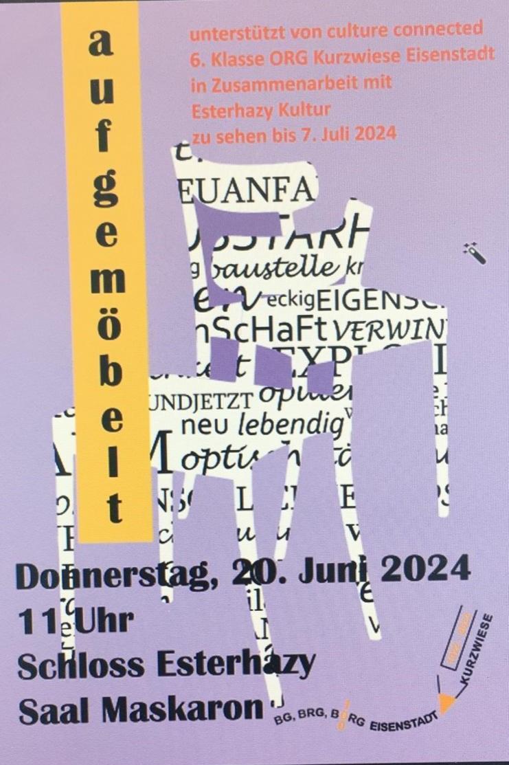 Im Kunstunterricht liegt der Schwerpunkt der 6. Klassen auf der Auseinandersetzung mit einem historischen Möbelstück (Funktion, Gestaltung, formale und ornamentale Elemente...) und der Eigeninterpretation desselben. Hier gestaltete jede Schülerin/jeder Schüler ein Möbelstück oder einen Entwurf, der im Rahmen einer Ausstellung mit dem Titel "Aufgemöbelt" im Schloss Esterházy gezeigt wurde. Im Rahmen einer feierlichen Vernissage wurden die Werke präsentiert und die jungen Künstler/innen vorgestellt.